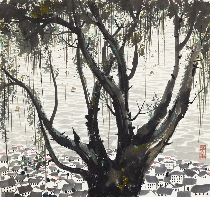 1974年,已步入55岁的吴冠中先生将绘画的重心转向中国水墨画的创作。纵观吴先生七十年代的水墨画作品,大多呈现出相对写实、刻画细腻、深入的绘画品貌。虽长期未有对宣纸、水墨的接触,却依旧笔墨纵横、笔力挺健、笔法自如流畅、刻画生动、情真意浓,不仅顺利突破了固有程式的束缚创造出鲜明独特的个人风格,并获得了美术界及观众的广泛好评。此幅《古树长城》即是这一时期极具代表性的作品之一。画中古老的松树占据了大部分的画面,这种构图方式,使得古树几欲跃出纸面之上。吴冠中以古朴苍劲的树枝入画,用浓重的墨线切凿出了枝干肌理。古树远处,则以万里长城为背景。长城置于山丛之中,笔道雄浑,转折顿挫间尤见速度感。吴冠中喜欢画树,画各种各样形态各异的树木,他还曾专门撰写了散文,谈他对树木的喜爱。他说过:“树不仅是生命的标志,也是艺术的标志。生命之树长青,其实是艺术生命长青”。树在吴冠中的思想中,其实就是他的艺术。他表现了树,同时也让树代他说出了他的艺术思想。就像在这幅《古树长城》中所看到的,吴冠中在刻画和表现这些历经沧桑的古木老树和蜿蜒长城时,很少纠结于外在的细节处理,因为这些根本就已经不再重要,纠结于此,只会束缚对其内在气质的表现。就如米开朗基罗晚年的雕塑,不再像早年对待作品那般精打细磨,因为他要做的是尽快的从精神上将这些石头中被束缚的灵魂释放出来。