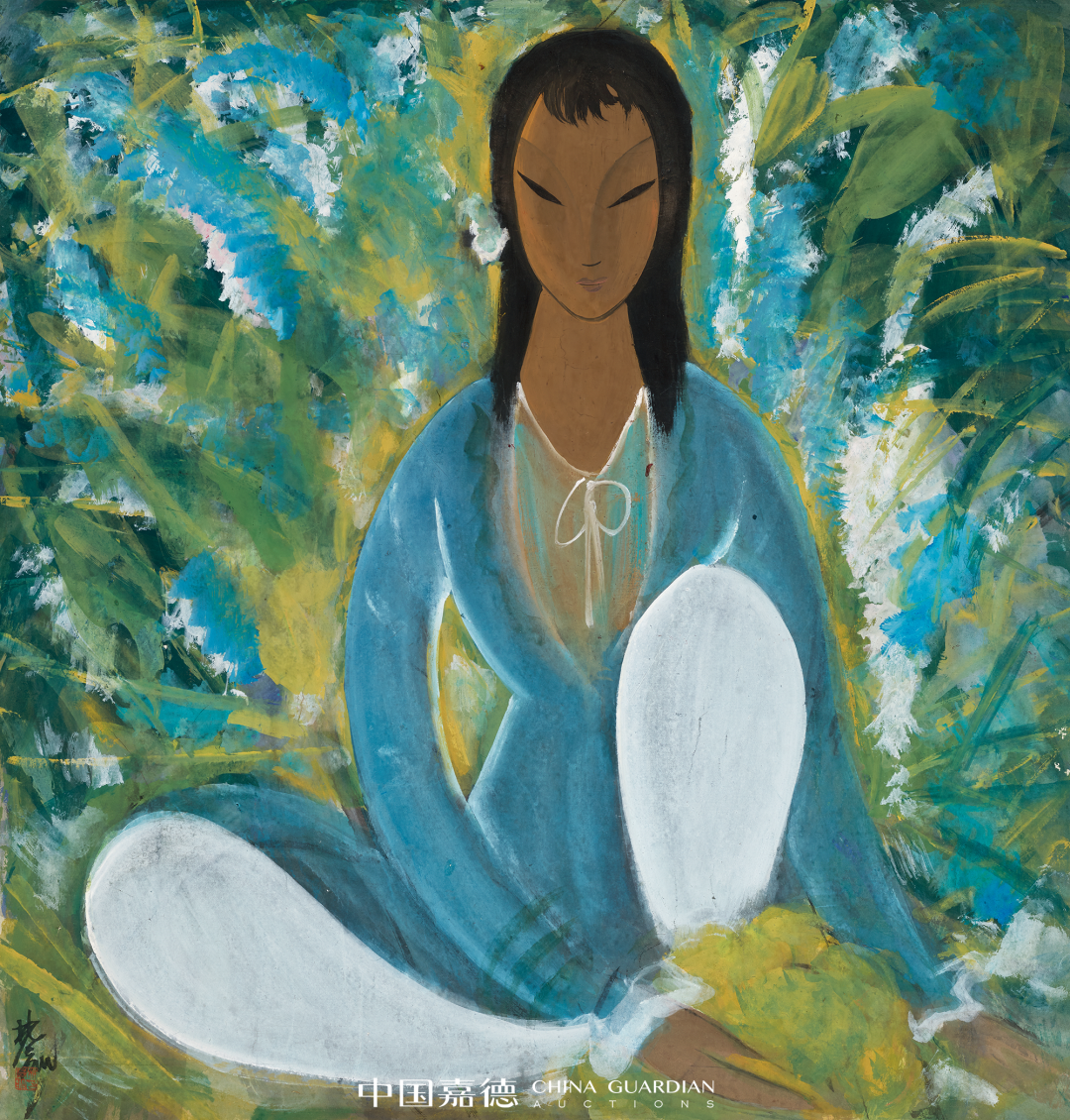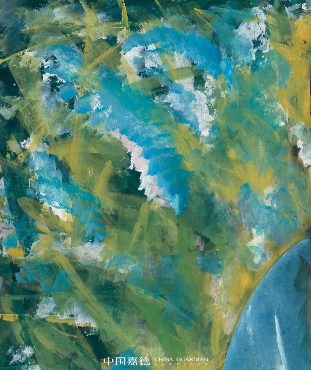 这件《花荫仕女》满幅构图,几无任何空隙,通篇画幅以浓重蓝绿背景与白彩为主色调,在相近的色域中展现丰富的变化,由黄绿、翠绿、蓝绿、青绿、到浓重的墨绿,一反传统中国画中对于色彩清淡的用色,一展艺术家驾驭色彩的高妙,并在色域的浅降浓郁之间,拉出前后空间的纵深。背景色调用白粉、蓝色和绿色铺满,笔钝而颜色用的很厚,甚至在视觉上接近油画,这是典型的西画方法。花荫中的仕女,脸长而圆润,发不束而披肩,以白粉叠加所勾勒的衣襟、白裤产生透明的光感和生涩的笔触肌理,这是典型的东方女性形象。背景和人物的处理方法是中西两大体系的交融,曲与直,圆与方,多与少,色与墨,在矛盾中形成对比的张力,并诉说着娴静慵懒的时光。Lot 497