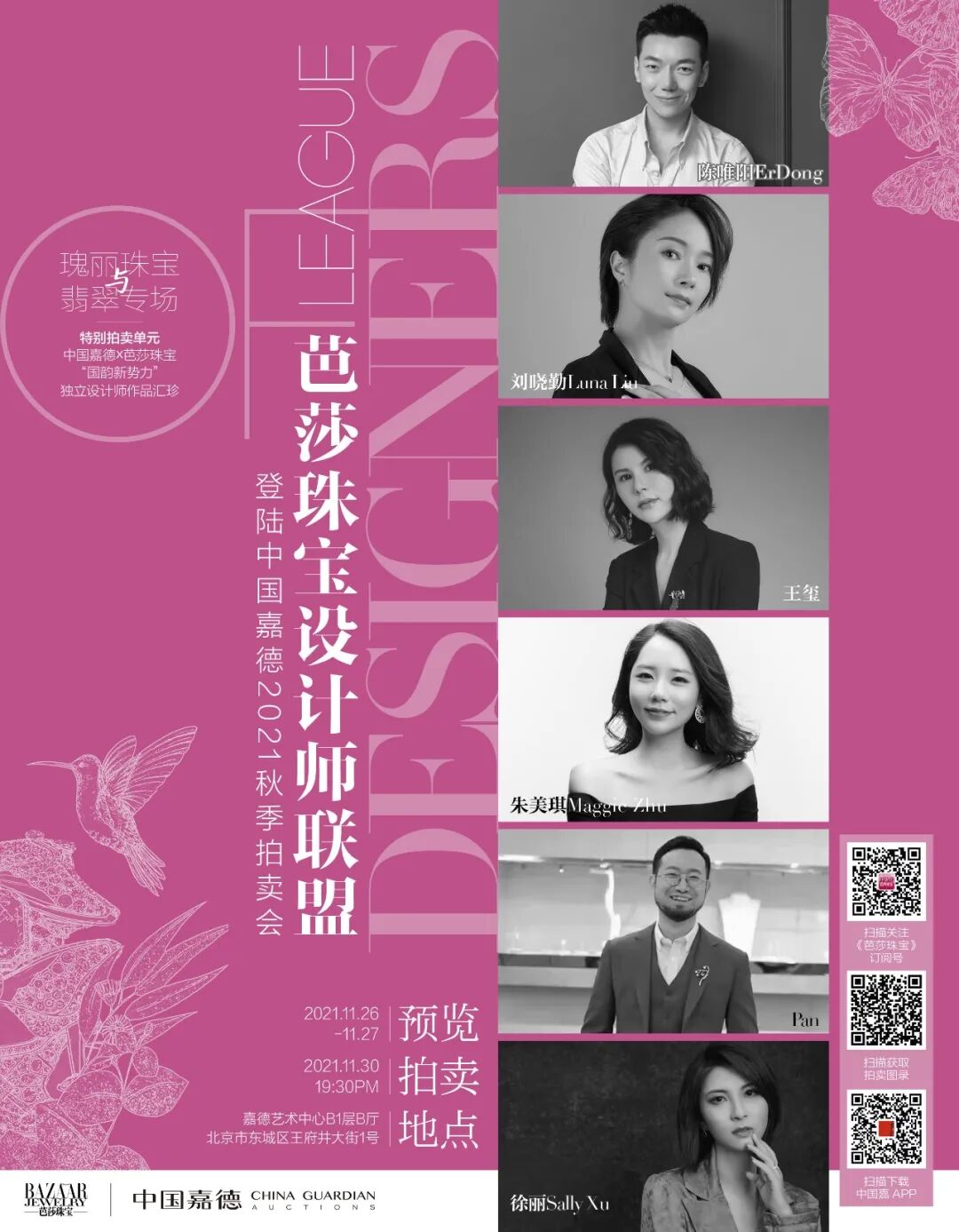 “2020年《芭莎珠宝》与中国嘉德的设计师拍卖项目正式启程,并备受瞩目。在这个舞台之上,我们看到了中国优秀独立珠宝设计师的潜力和才华,也看到了中国珠宝藏家对于设计价值的认可以及愈加高尚的艺术品味。今年,《芭莎珠宝》再次与中国嘉德携手,经过多轮的精挑细选,我们集结了 6位优秀珠宝设计师,他们的作品各具特色,将宝石与设计师的精神世界做了完美的融合与表达。”这些设计师们不仅拥有傲人的才华,也拥有非常强大的自信和勇气,他们愿意将自己的作品交给市场去衡量。特别是其中的多件作品都将以无底价的形式起拍,而决定这些作品的最终价值的人就是你。让我们一同认识一下他们以及他们的作品吧。