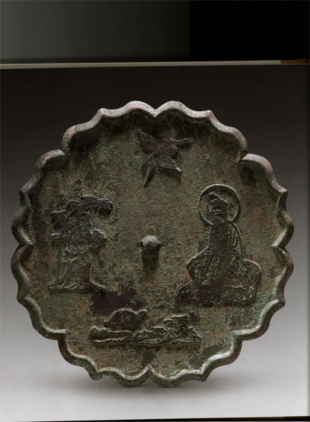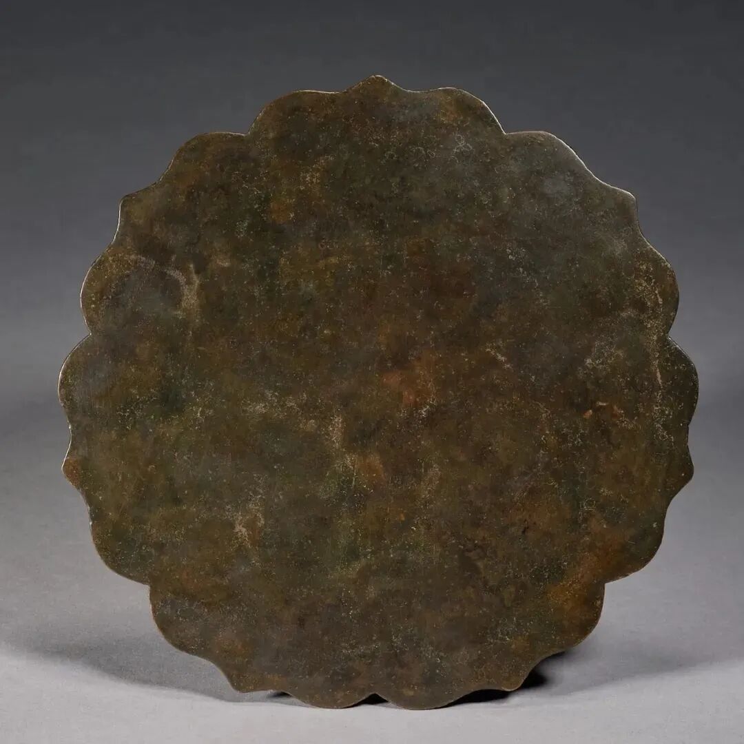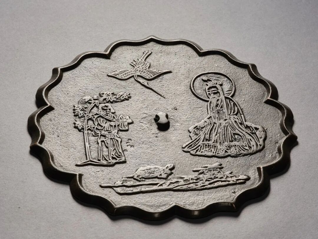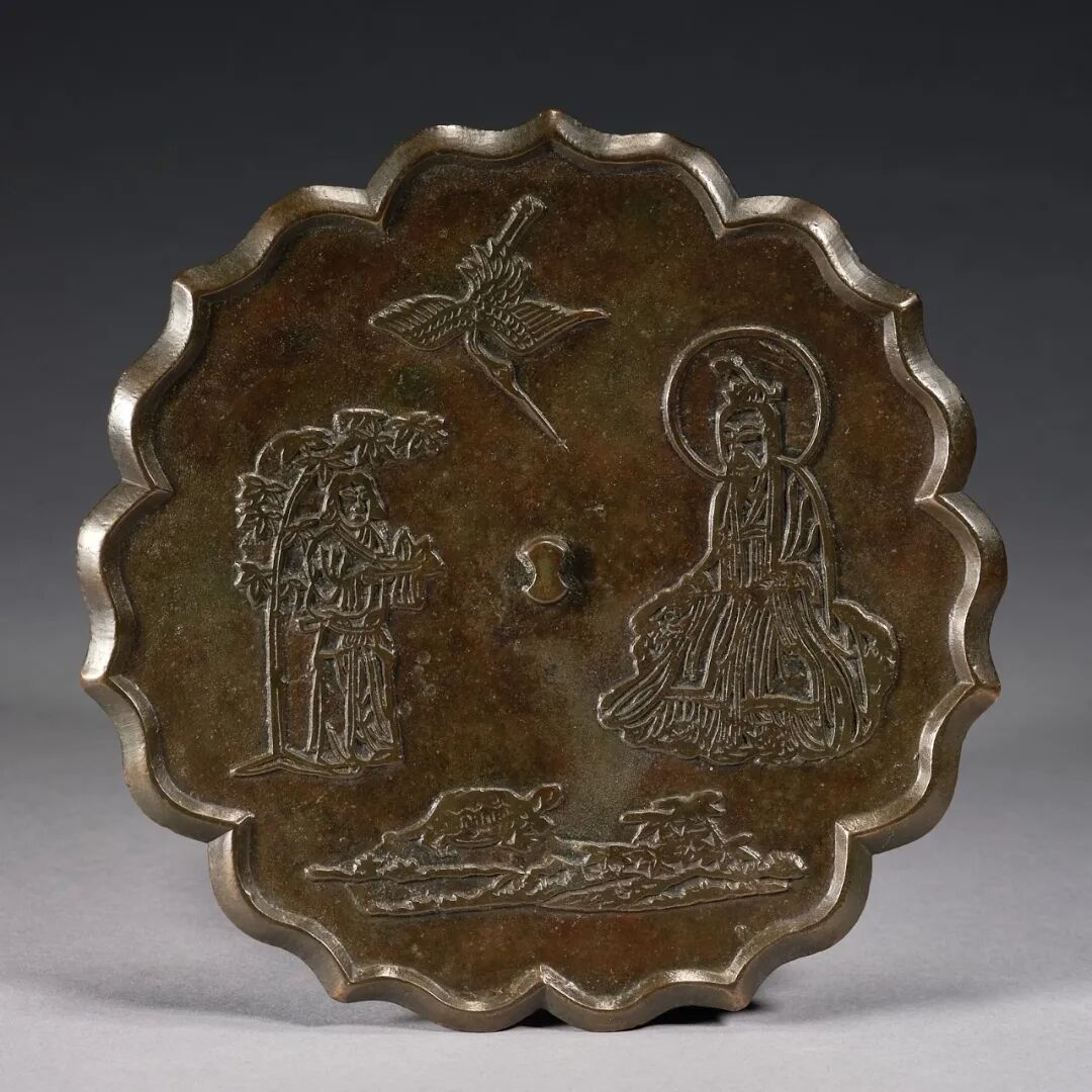 此件棱形镜为七出菱花形,银锭钮。镜背图案用线雕技法制作。星官端坐姿态。头戴道冠有背圆光,着对襟宽袖长袍,手拿佛尘。钮左侧一侍女,双手托盘于身前,面对星官而立。空中一仙鹤,地下一灵龟。整个画面突出了星官的道貌仙骨。此镜人物造型简约传神,场面富有美感,做到了情景交融,极具感染力。参阅:《故宫铜镜图典》第 200-201 页,仙人龟鹤纹菱式铜镜。