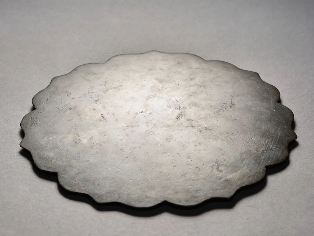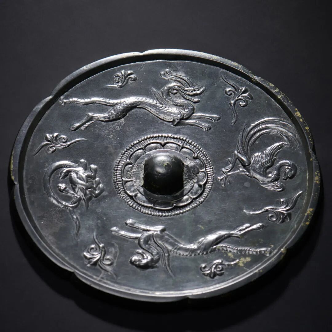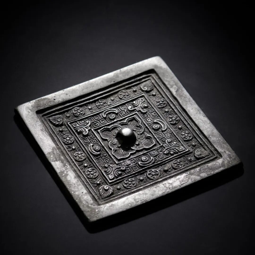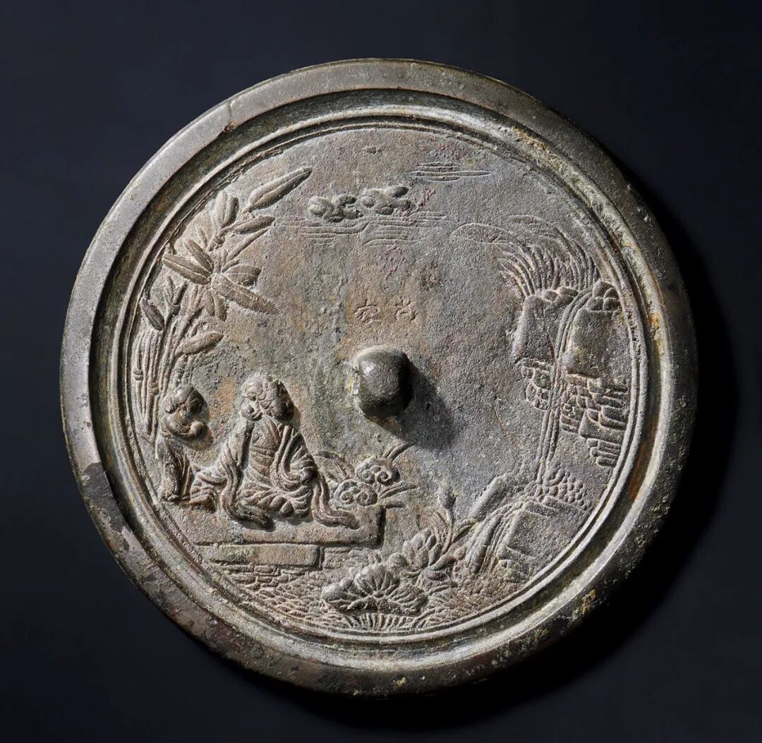 此件棱形镜为七出菱花形,银锭钮。镜背图案用线雕技法制作。星官端坐姿态。头戴道冠有背圆光,着对襟宽袖长袍,手拿佛尘。钮左侧一侍女,双手托盘于身前,面对星官而立。空中一仙鹤,地下一灵龟。整个画面突出了星官的道貌仙骨。此镜人物造型简约传神,场面富有美感,做到了情景交融,极具感染力。参阅:《故宫铜镜图典》第 200-201 页,仙人龟鹤纹菱式铜镜。