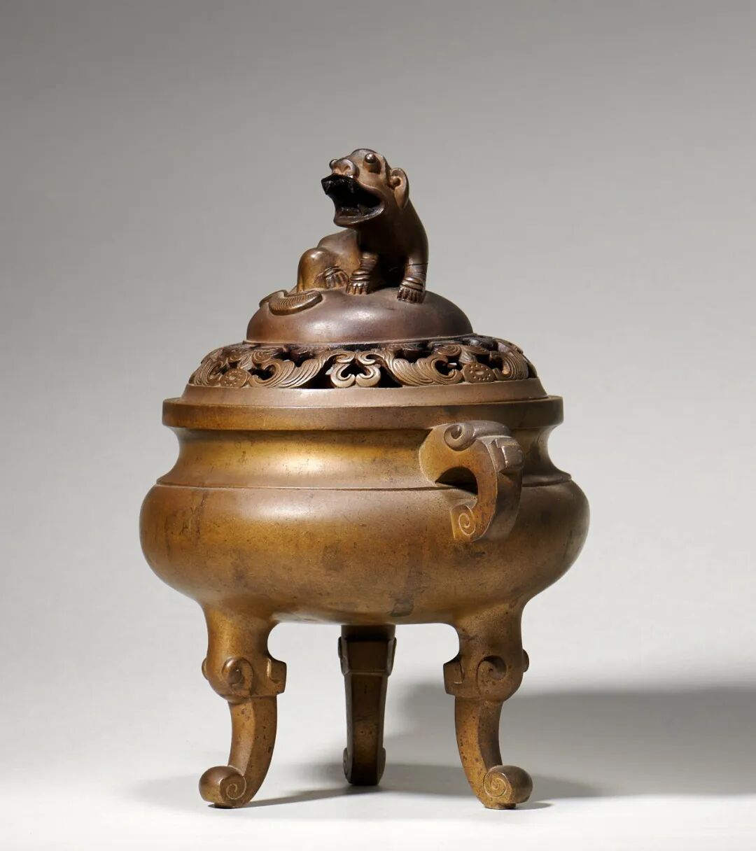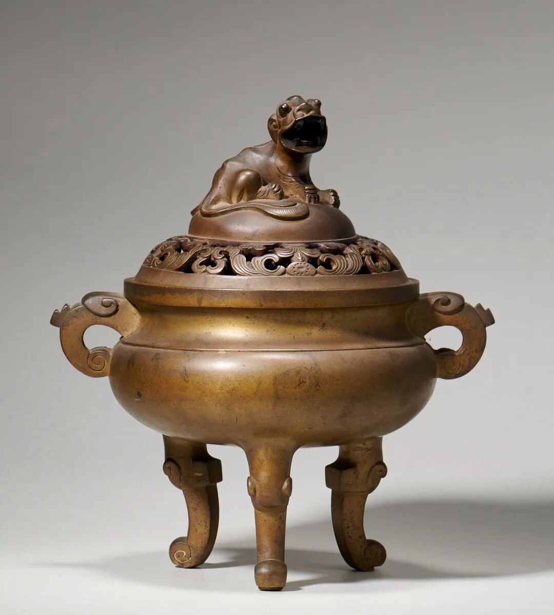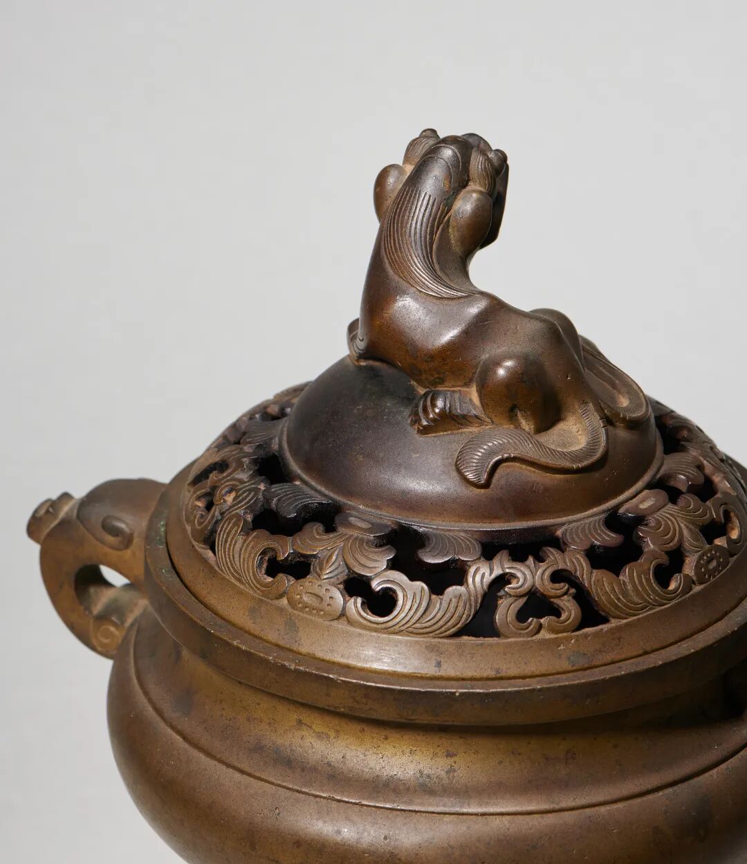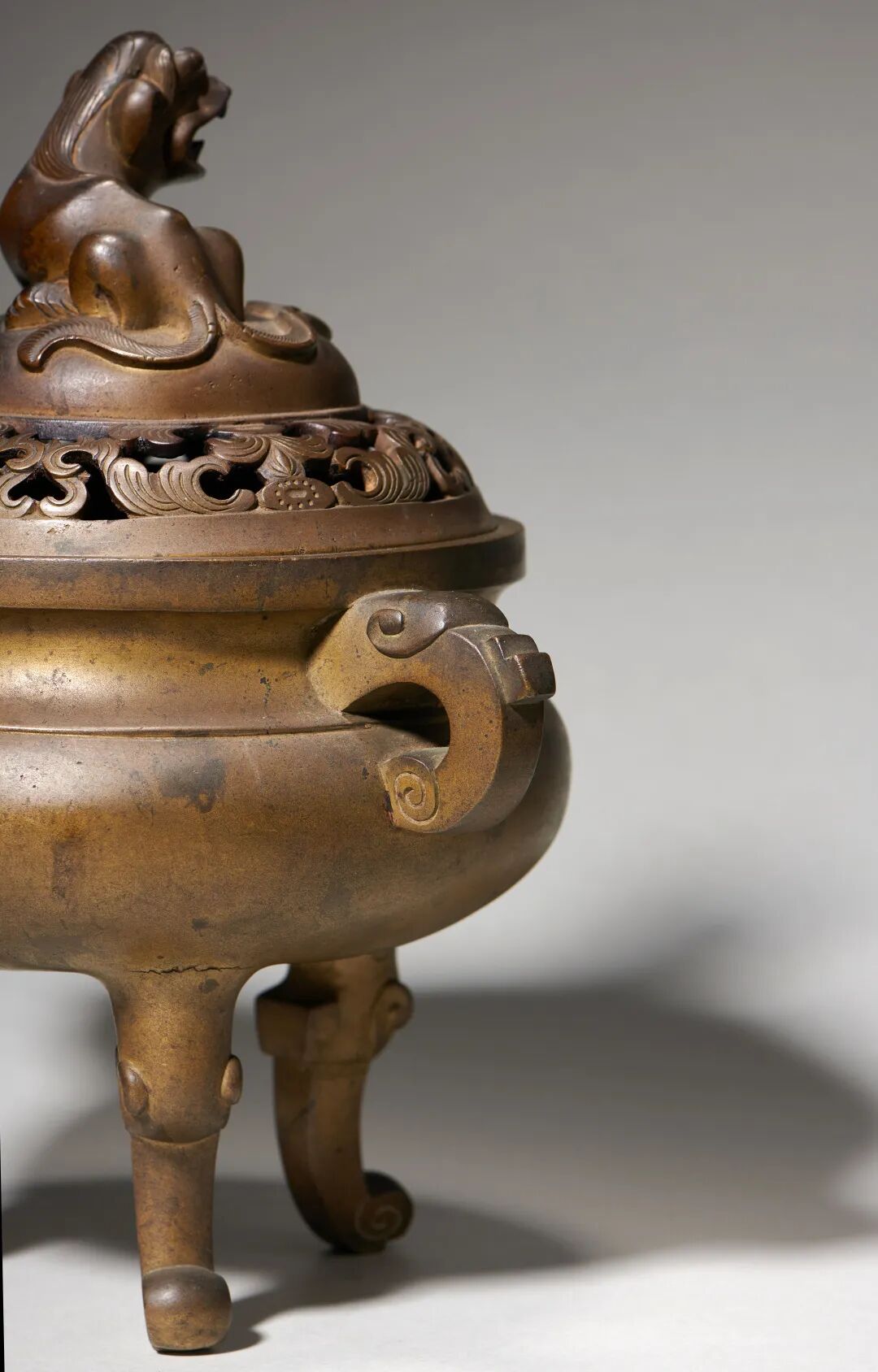此件狮钮双耳香熏为铜制,鼓腹、两耳、三足。瑞兽钮回首侧望,双目炯炯有神,前立后踞,狮尾盘身,作近蹲立状,灵动张扬。盖部镂空浮雕花草纹,既为装饰,又利出烟,肩及腹部饰以双耳,为卷云状,为宫廷经典样式。炉底三足,呈三弯腿卷珠足。器底錾刻“玉堂珍玩”。整体造型端庄凝重,古朴大度,为清代熏炉中难得的佳作。“玉堂”相传为严东楼的字号,严东楼乃严嵩之子所建。