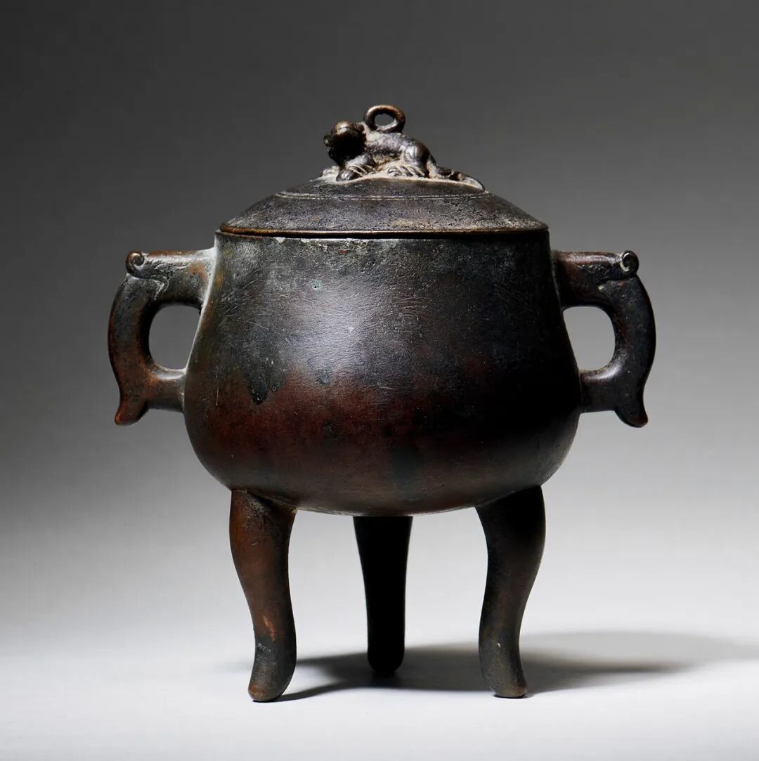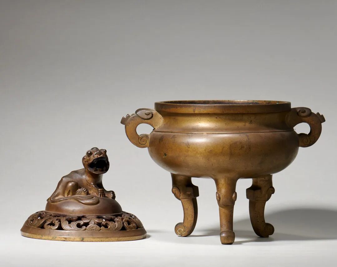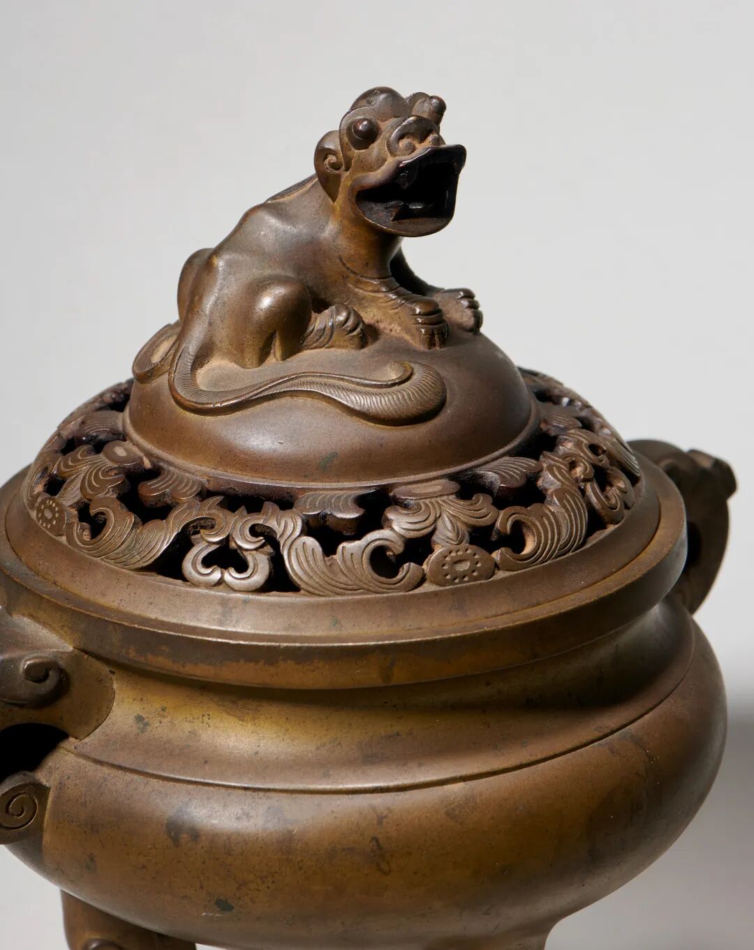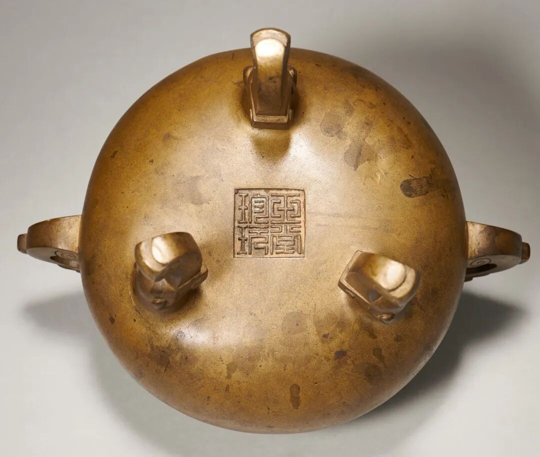此件狮钮双耳香熏为铜制,鼓腹、两耳、三足。瑞兽钮回首侧望,双目炯炯有神,前立后踞,狮尾盘身,作近蹲立状,灵动张扬。盖部镂空浮雕花草纹,既为装饰,又利出烟,肩及腹部饰以双耳,为卷云状,为宫廷经典样式。炉底三足,呈三弯腿卷珠足。器底錾刻“玉堂珍玩”。整体造型端庄凝重,古朴大度,为清代熏炉中难得的佳作。“玉堂”相传为严东楼的字号,严东楼乃严嵩之子所建。
