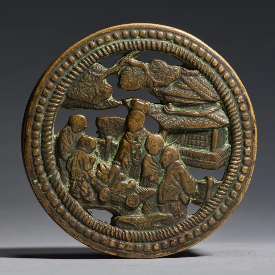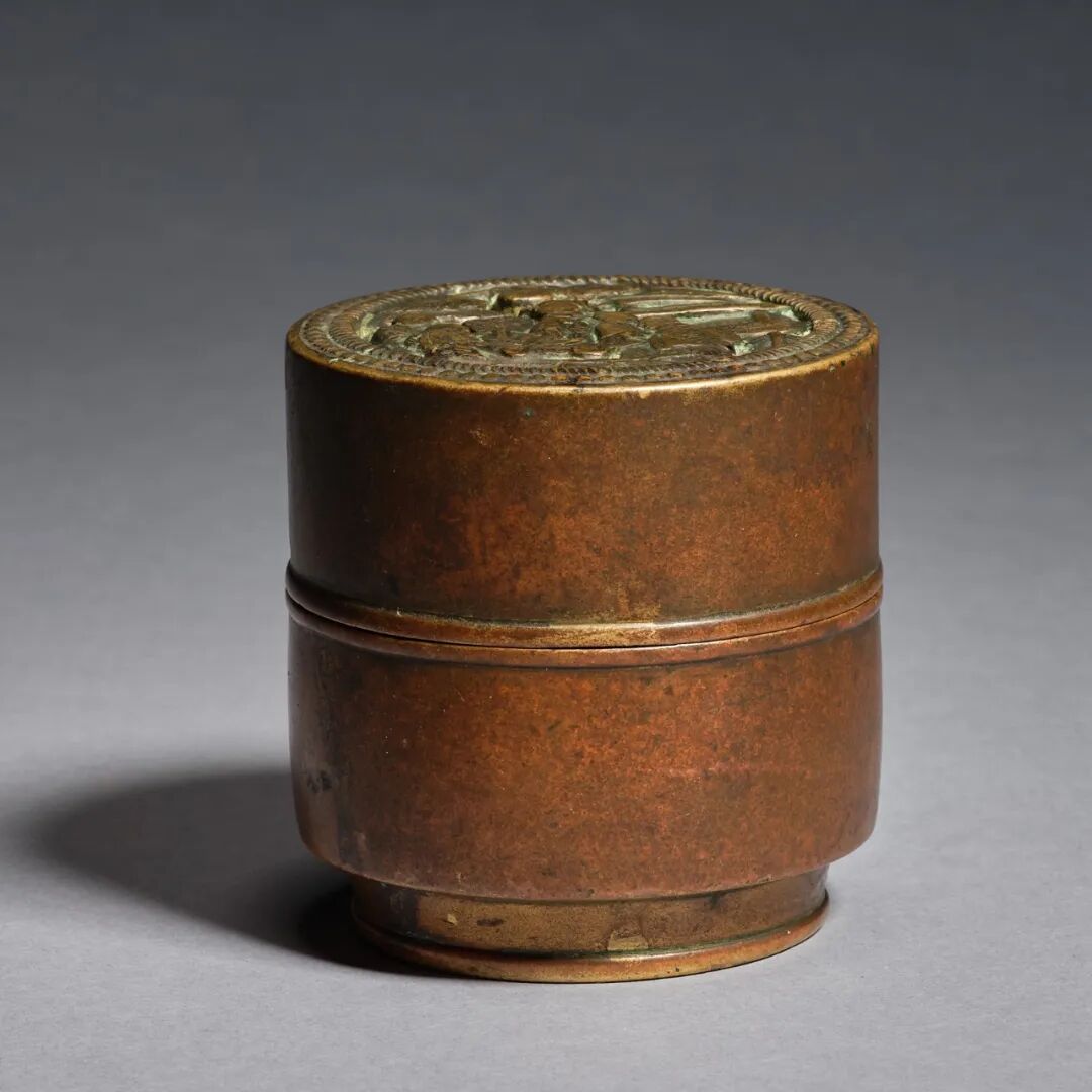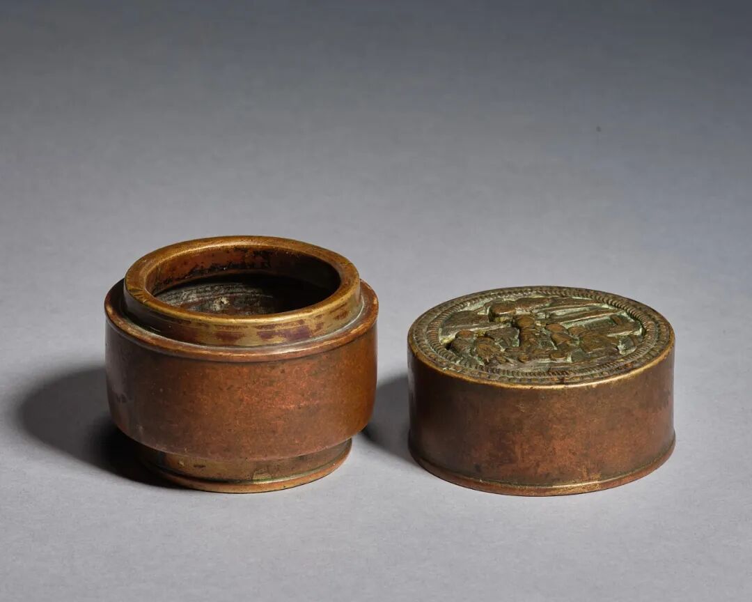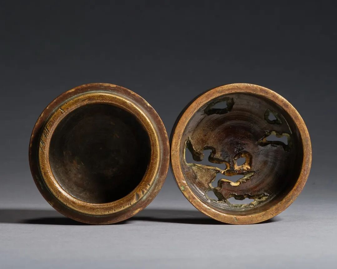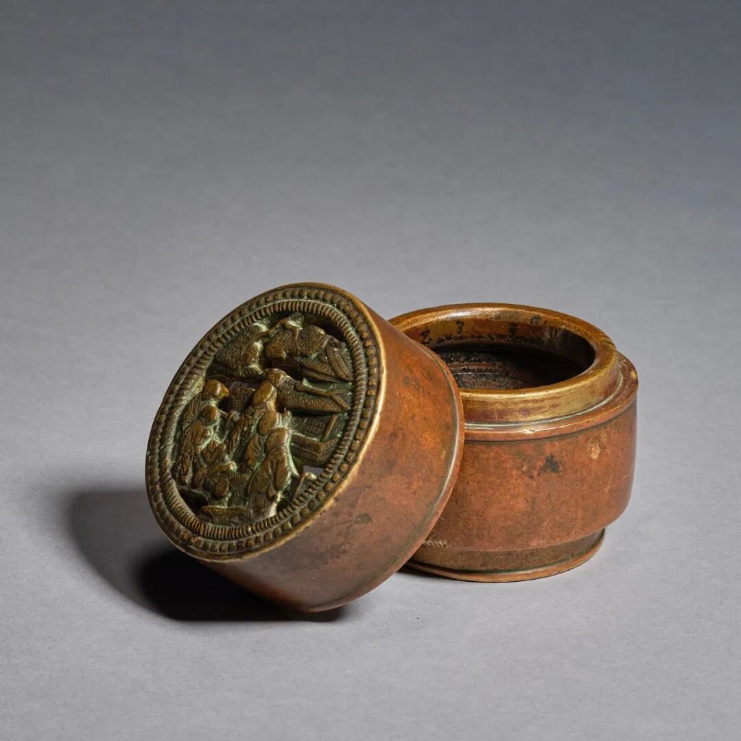 此香熏作筒式,由筒身和熏盖两部分构成。熏盖镂雕婴戏图,以松枝和亭台为景。子母口,筒身竖直,下呈高圈足。整器筋骨分明,线条柔美,皮壳似周身洒金,具有典型明代正德时期铜炉特征。文献记载,正德皇帝还有一个阿拉伯文的名字,叫作妙吉敖兰(mejid-Allah),意为安拉的荣耀。阿拉伯文香具于正德朝多用于皇室内府赏赐功臣或御赐于清真寺用于殿堂陈设,民间少有流传。其特征鲜明,如此炉一致,以黄铜铸就,铜质精炼,入手沉坠,观之若金。包浆色泽沉稳,若美玉之莹润!在明正德阿拉伯文炉瓶三事里,仅炉底部铸“正德年制”款识。而瓶、盒少有铸款。而此件为镂空铸造婴戏图样的薰。更是前所未见。可参阅2022年春季拍卖会古代艺术珍品夜场lot937,明正德阿文炉瓶三事。婴戏纹是中国传统吉祥图案,戏图的流行,反映当时的封建社会民众心理。把传统的传宗接代观念深入人心,因而寓意连生贵子、五子登科、百子千孙的图案,常见于器物装饰之上。较早见于唐代长沙窑的釉下彩绘瓷上,明代正德、嘉靖时期最为风行,清代也较为常见。婴戏图题材多样,可参阅明代(传)夏葵《婴戏图》,内容丰富,合绘魁星高照、五子登科、吉祥有余、五谷丰登等喜庆场面。画中的胖娃娃身着锦衣披彩,绫罗绸缎;憨态可掬、出于富贵之家,童儿在嬉戏中表现出的生动活泼的姿态,专注喜悦的表情,稚拙可爱的模样,悦人心生怜爱,画中儿童或玩耍,或嬉戏,千姿百态,妙趣横生。能感受到童稚世界的无忧无虑,象征着社会安定、生活美满,多子多福。