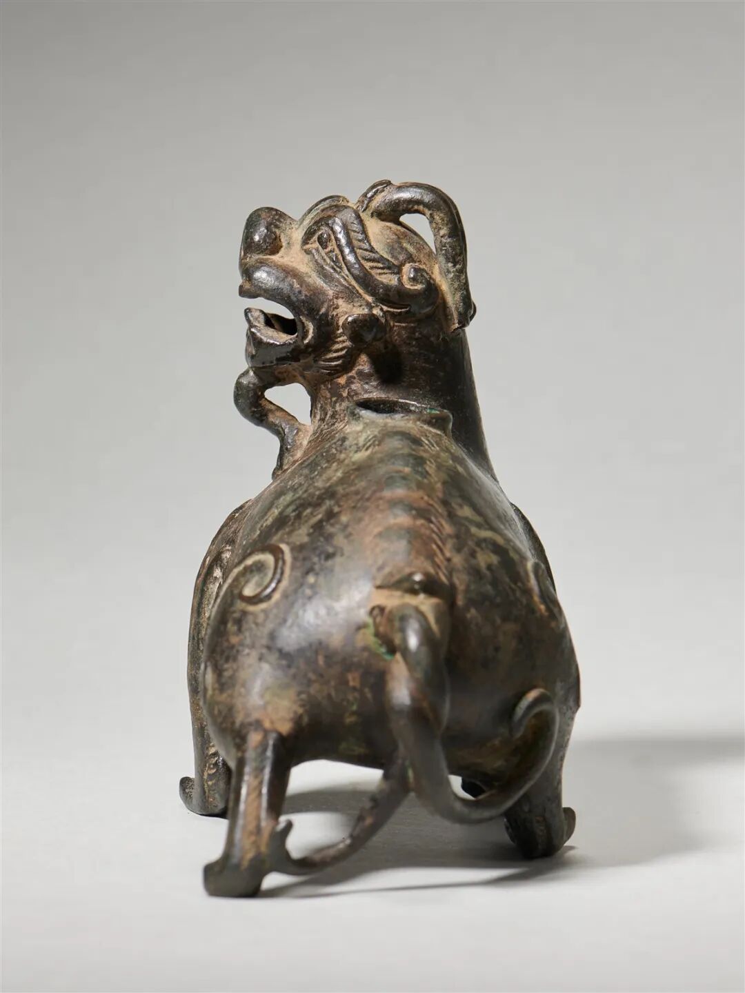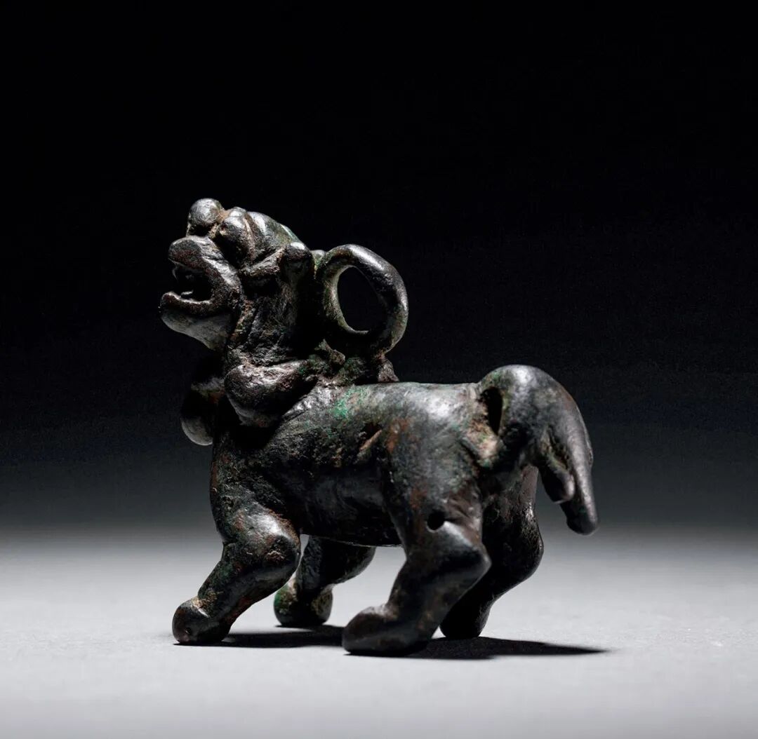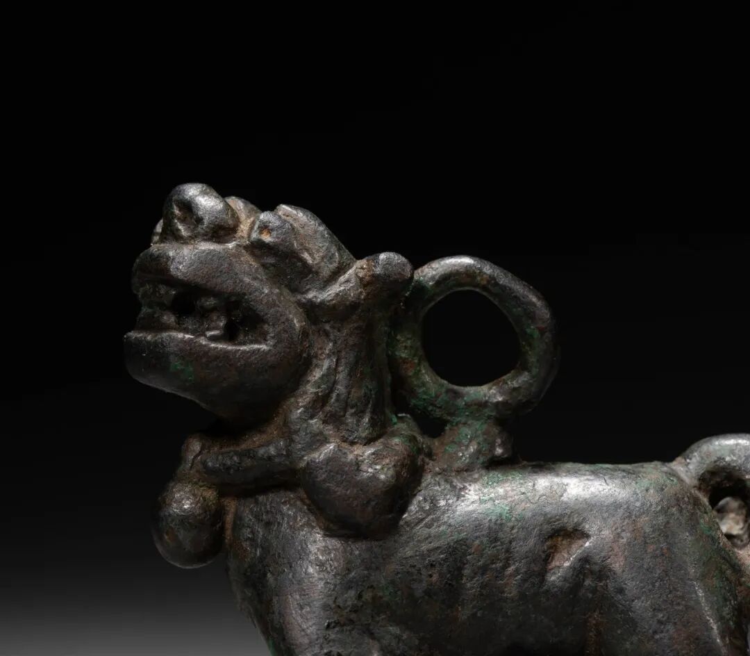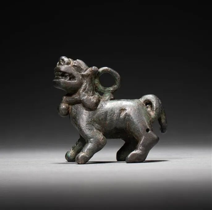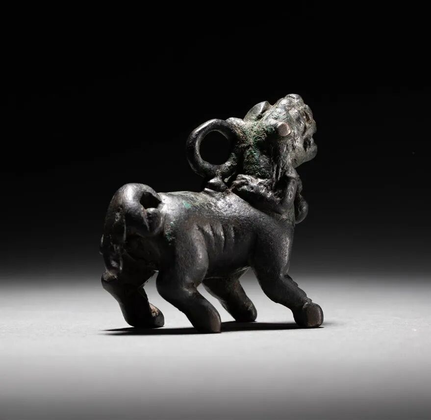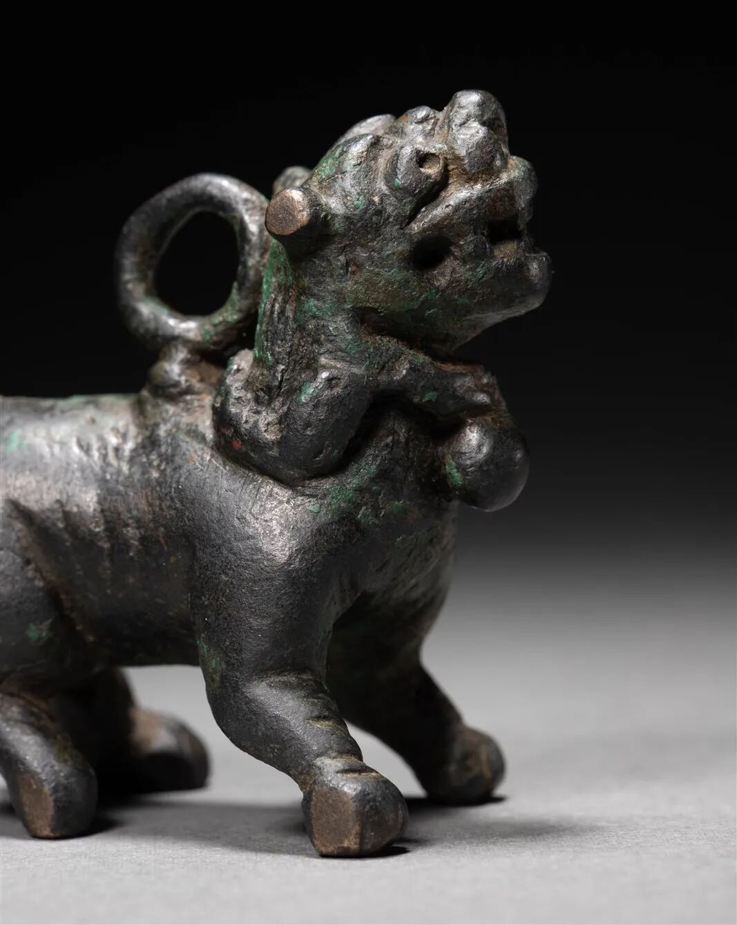 狮子具有威严的特质,佛教用以喻指佛陀,称佛陀说法为“狮子吼”,它还被视为佛教的护法,用作诸佛菩萨的坐骑。而在我国古代民间,它也得到了广泛应用,被制成各种器物,表达喜庆祥和之意。此件狮子身形矫健,方头大耳,双目圆睁,方口大开,阔鼻露齿,呈昂首阔步之势;颈部系有项圈,铃铛缀于胸前;背部有一圆环,显示是用于悬挂;身上鬃毛依稀可见,尾巴自然下卷。尤其值得注意的是,其尾端鬃毛分成两叉,一边鬃毛呈内卷状,其余自然下垂,非常生动的刻画出狮子奔跑时所呈现的状态,将万兽之王的威猛霸气展现得淋漓尽致。此狮采用圆雕技法制成,铜质精良,包浆厚重,造型夸张,张力十足,具有中原早期造型艺术的鲜明特征,堪为案头陈设和赏玩的佳品。