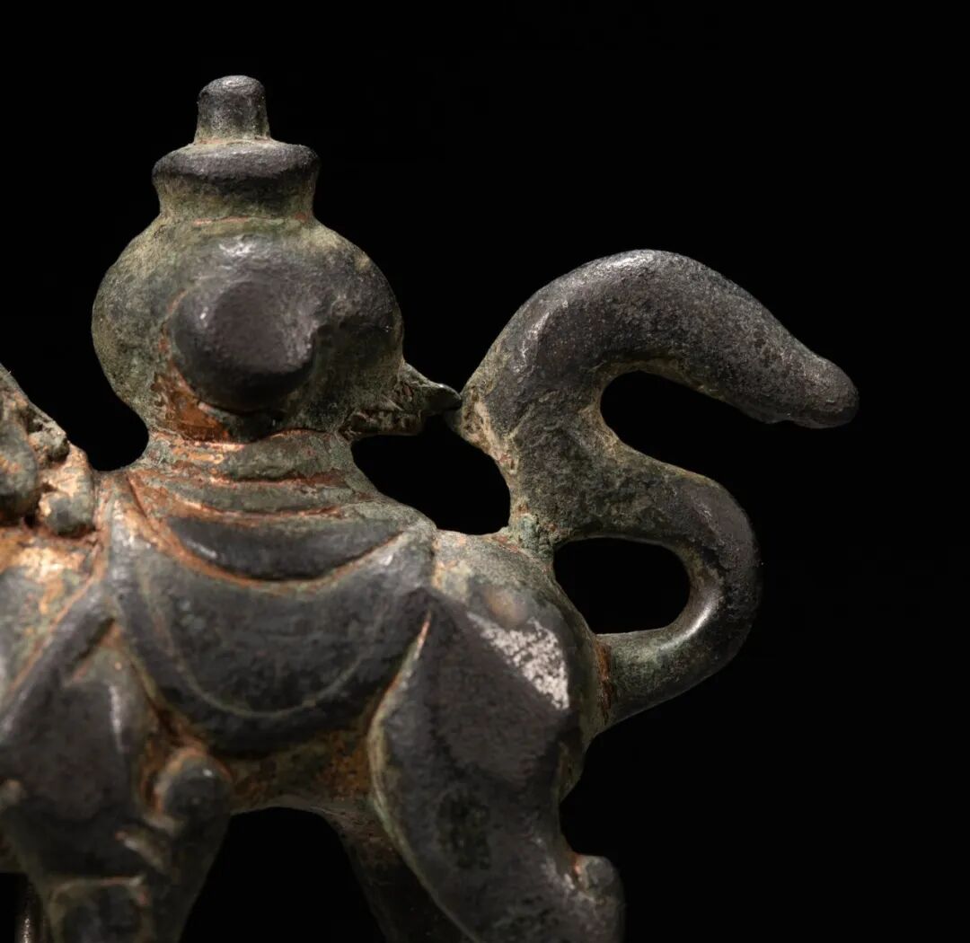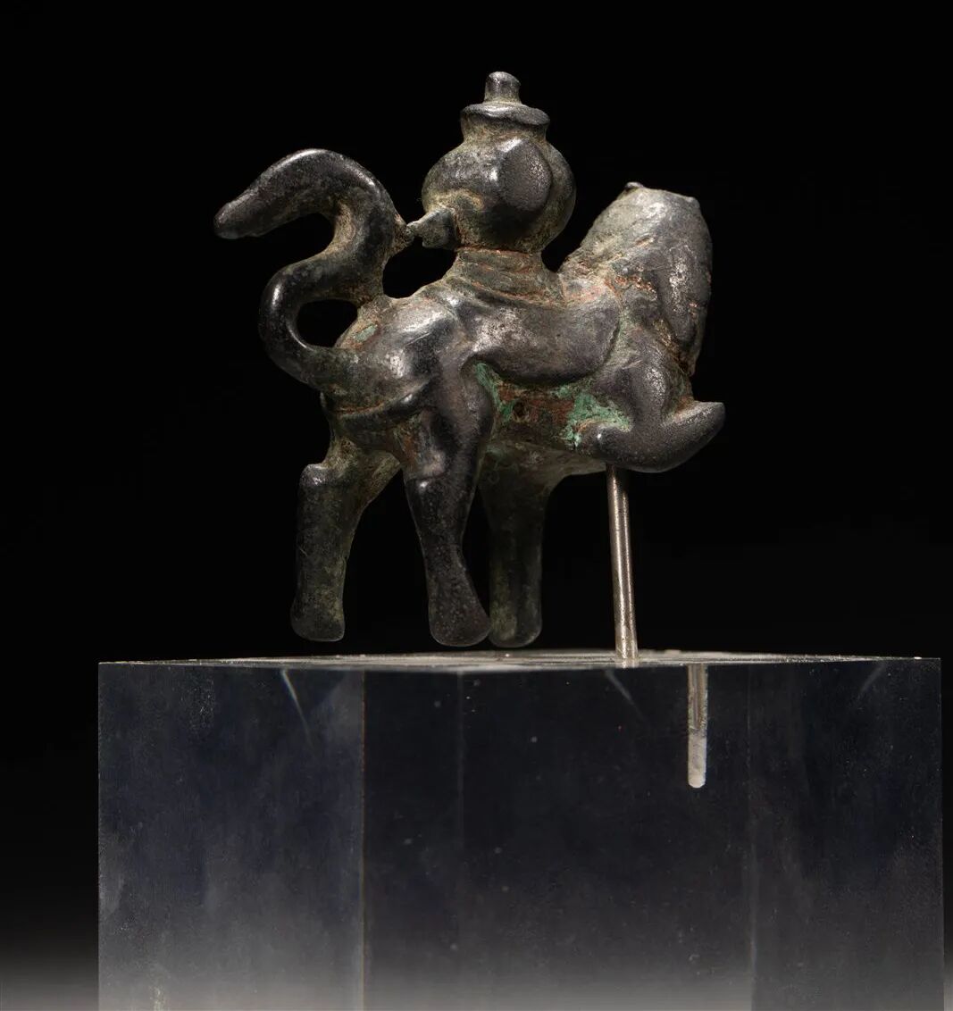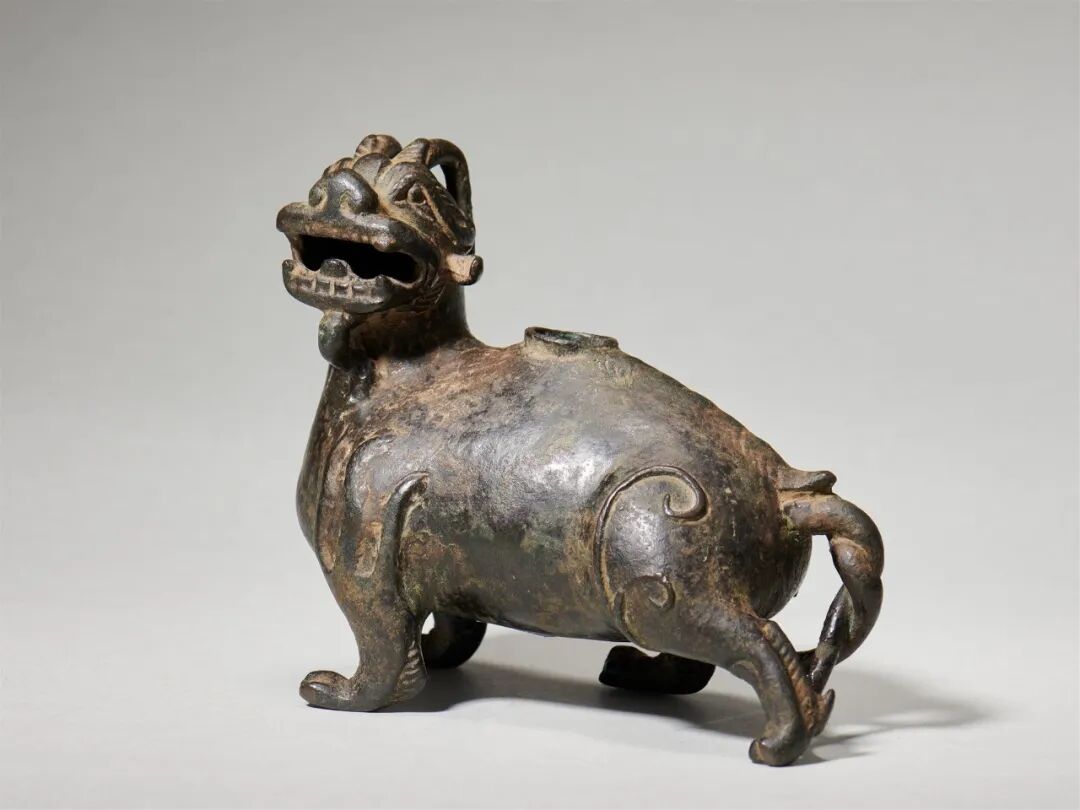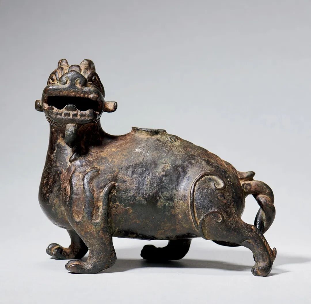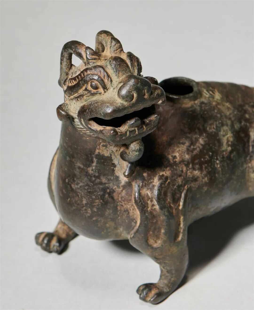 狮子具有威严的特质,佛教用以喻指佛陀,称佛陀说法为“狮子吼”,它还被视为佛教的护法,用作诸佛菩萨的坐骑。而在我国古代民间,它也得到了广泛应用,被制成各种器物,表达喜庆祥和之意。此件狮子身形矫健,方头大耳,双目圆睁,方口大开,阔鼻露齿,呈昂首阔步之势;颈部系有项圈,铃铛缀于胸前;背部有一圆环,显示是用于悬挂;身上鬃毛依稀可见,尾巴自然下卷。尤其值得注意的是,其尾端鬃毛分成两叉,一边鬃毛呈内卷状,其余自然下垂,非常生动的刻画出狮子奔跑时所呈现的状态,将万兽之王的威猛霸气展现得淋漓尽致。此狮采用圆雕技法制成,铜质精良,包浆厚重,造型夸张,张力十足,具有中原早期造型艺术的鲜明特征,堪为案头陈设和赏玩的佳品。