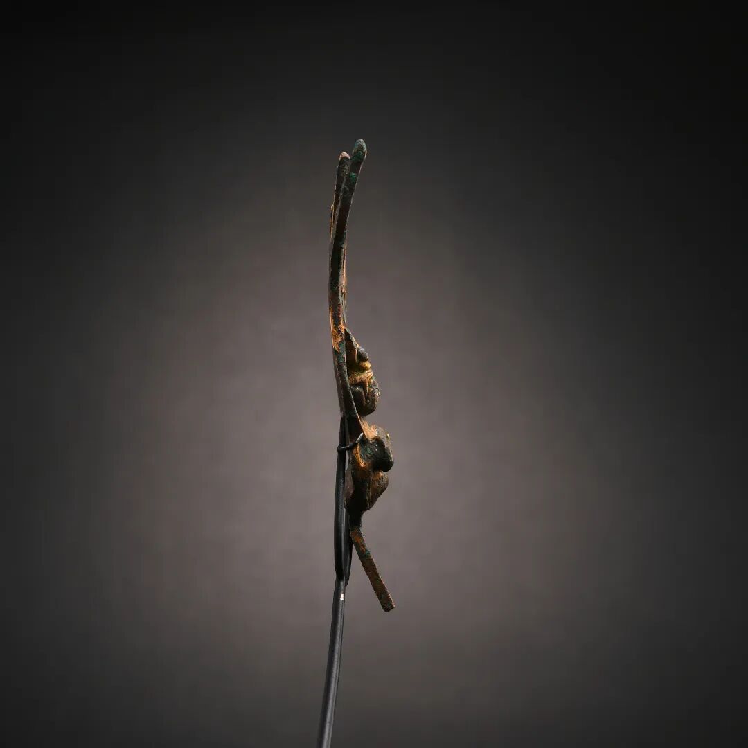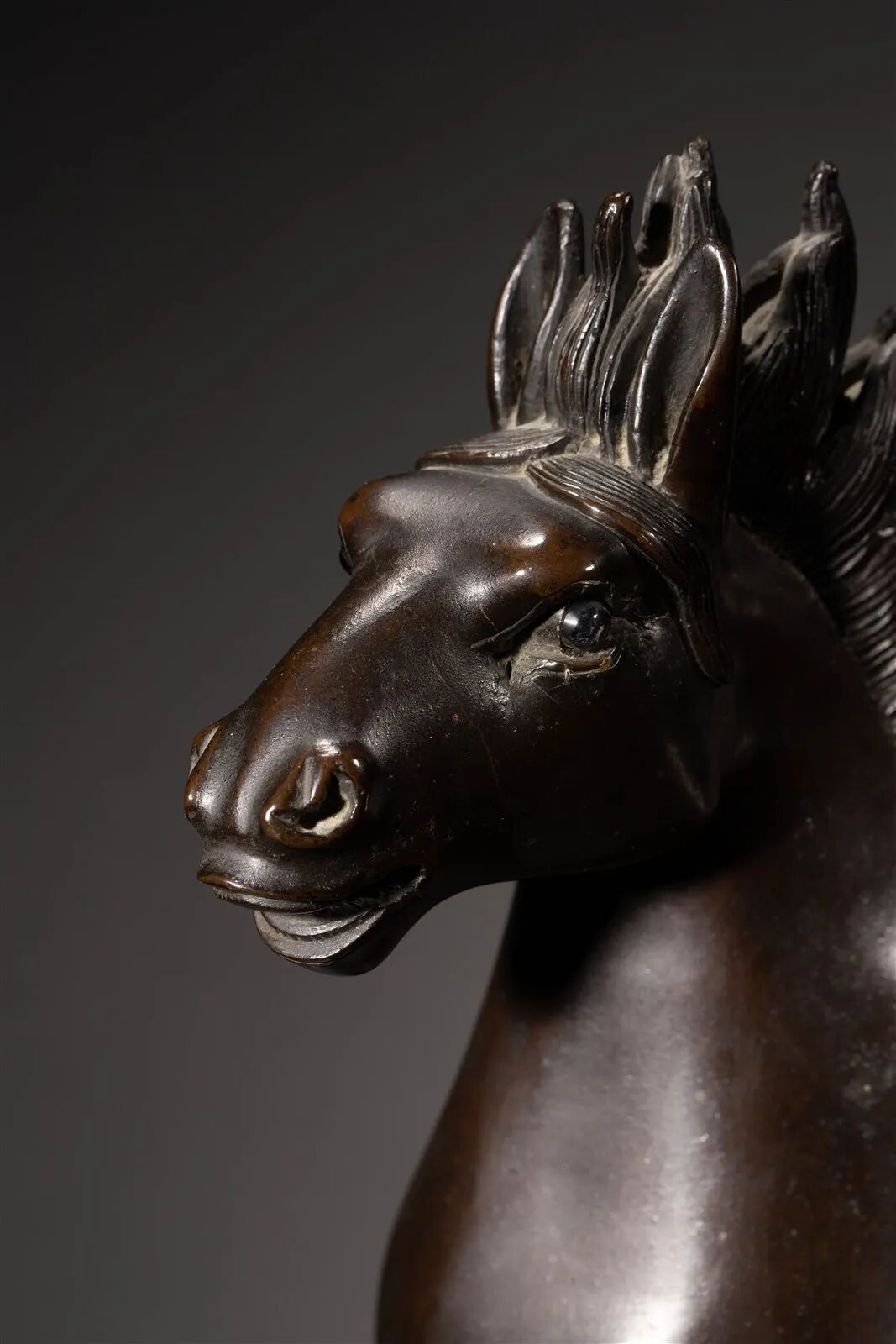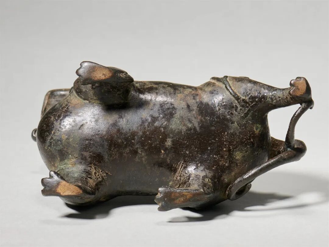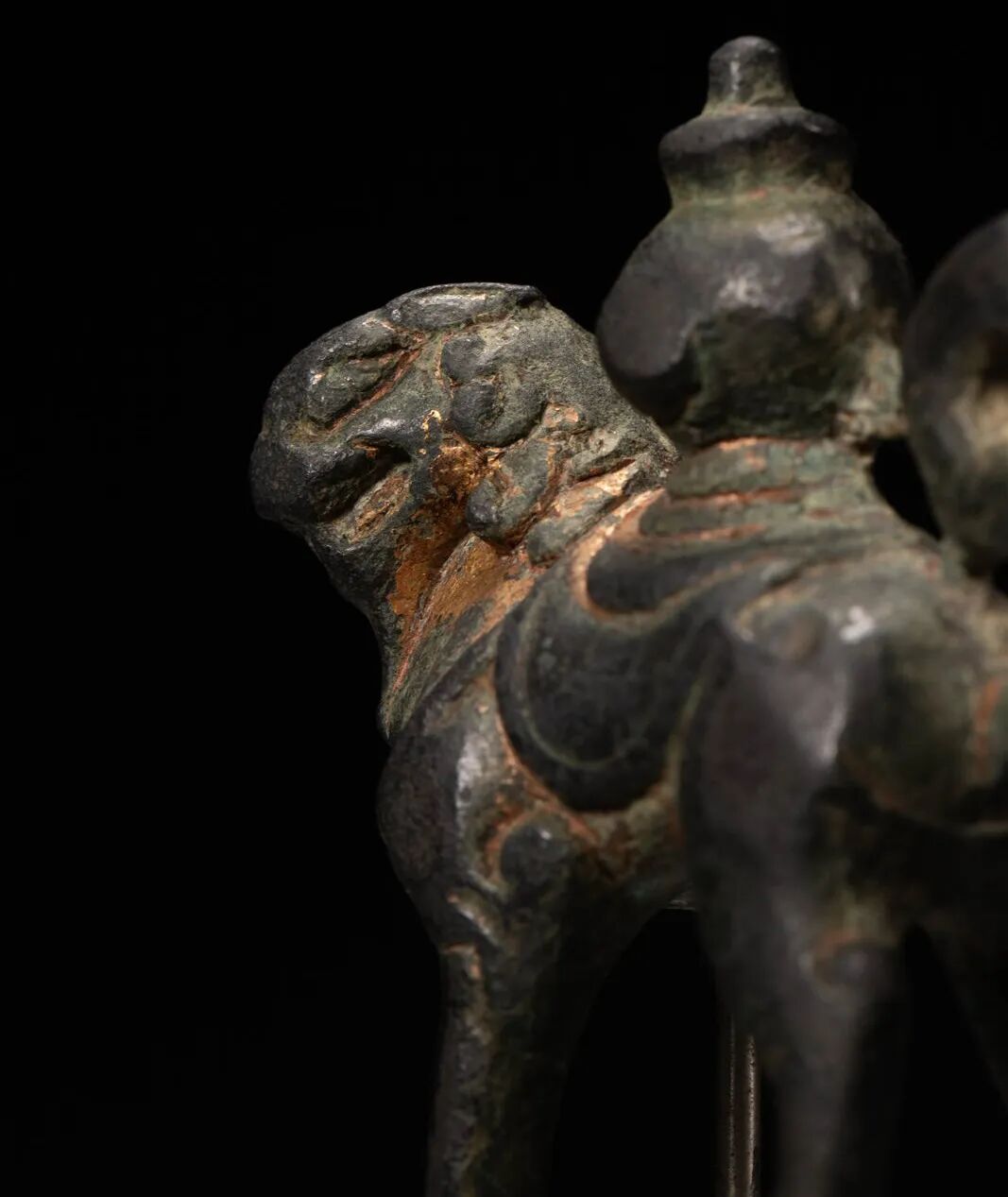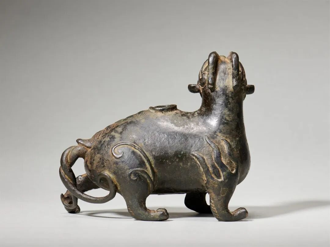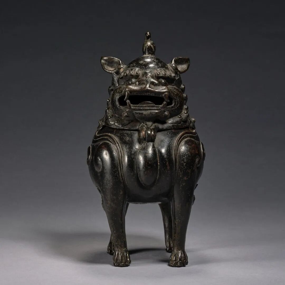 狮子具有威严的特质,佛教用以喻指佛陀,称佛陀说法为“狮子吼”,它还被视为佛教的护法,用作诸佛菩萨的坐骑。而在我国古代民间,它也得到了广泛应用,被制成各种器物,表达喜庆祥和之意。此件狮子身形矫健,方头大耳,双目圆睁,方口大开,阔鼻露齿,呈昂首阔步之势;颈部系有项圈,铃铛缀于胸前;背部有一圆环,显示是用于悬挂;身上鬃毛依稀可见,尾巴自然下卷。尤其值得注意的是,其尾端鬃毛分成两叉,一边鬃毛呈内卷状,其余自然下垂,非常生动的刻画出狮子奔跑时所呈现的状态,将万兽之王的威猛霸气展现得淋漓尽致。此狮采用圆雕技法制成,铜质精良,包浆厚重,造型夸张,张力十足,具有中原早期造型艺术的鲜明特征,堪为案头陈设和赏玩的佳品。