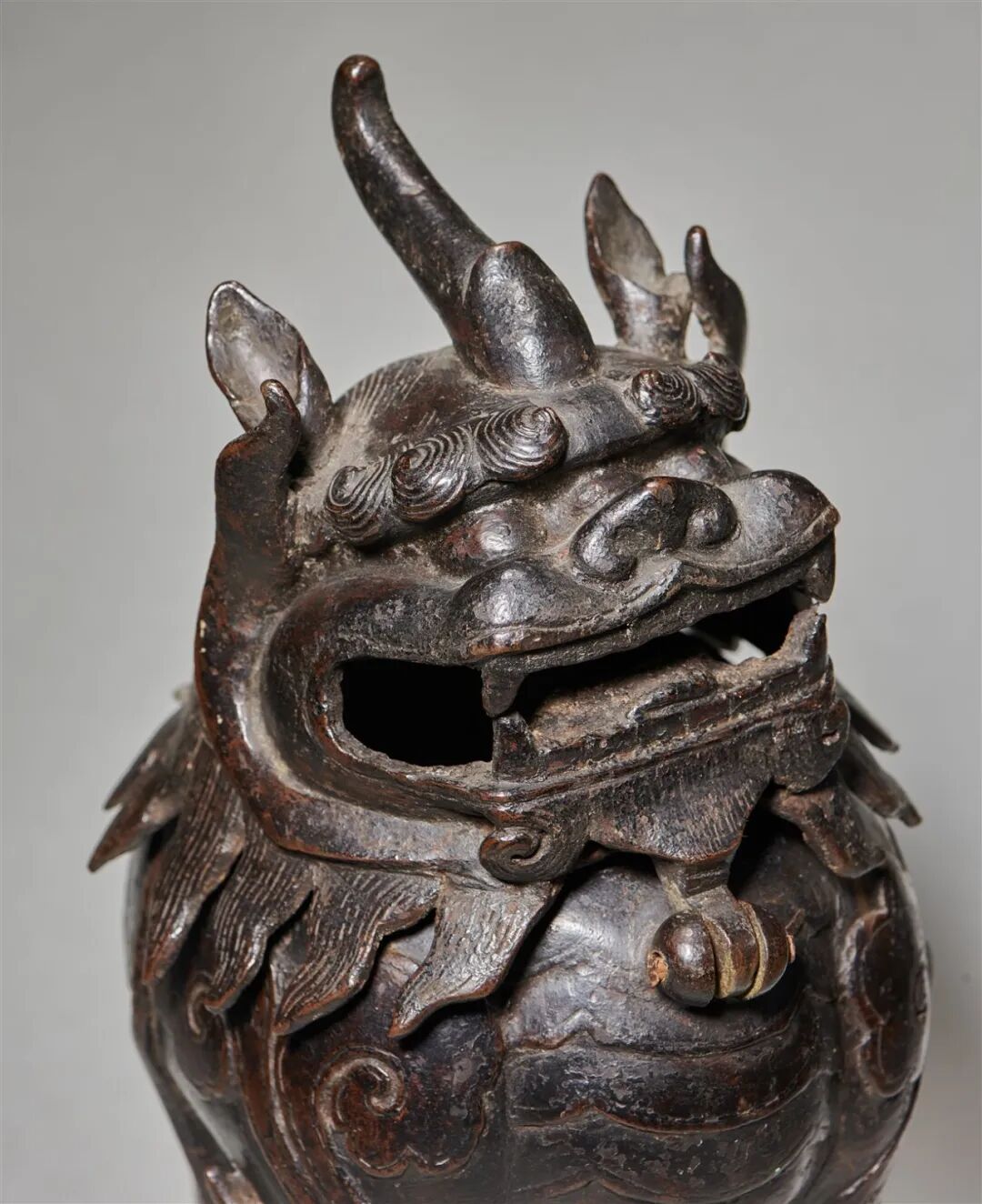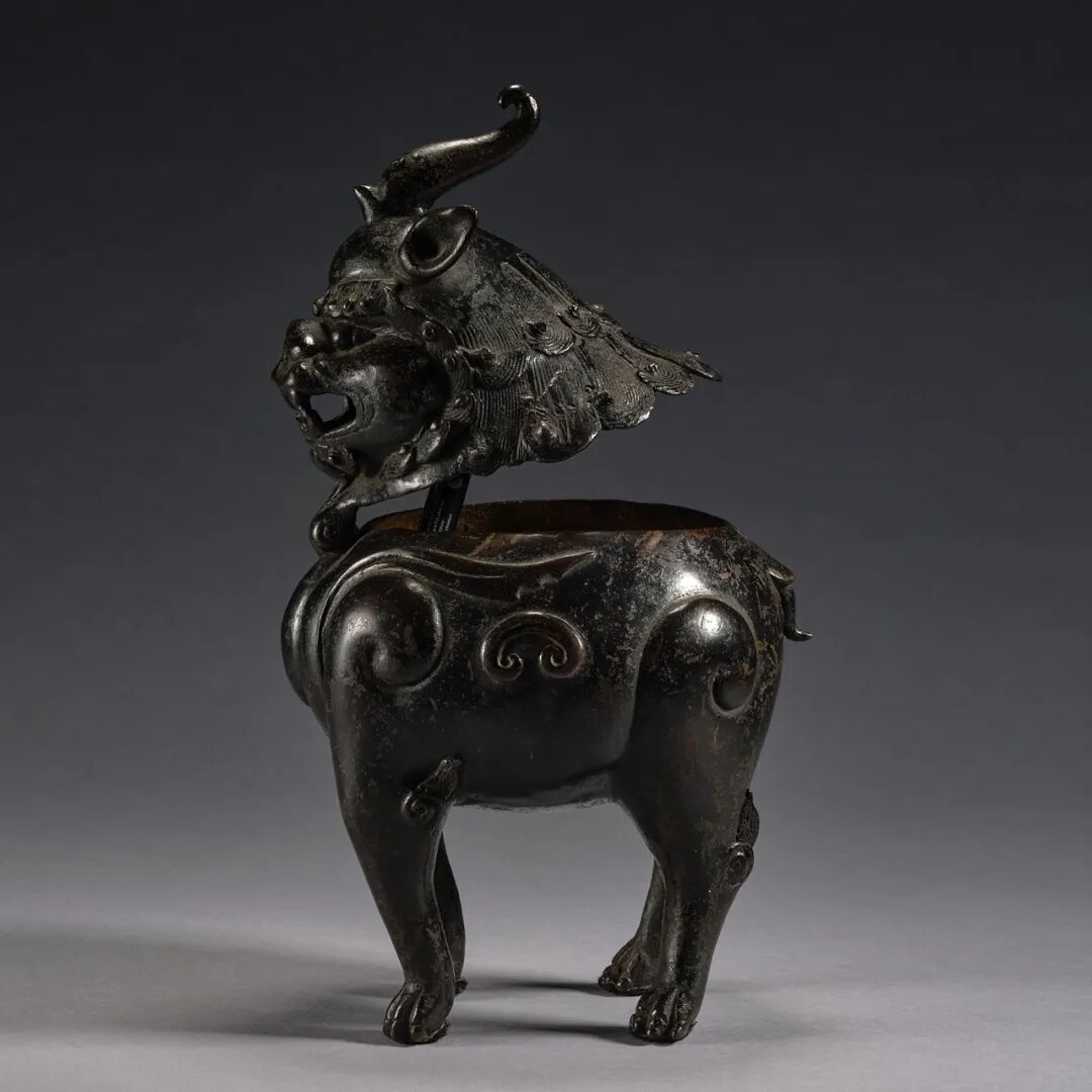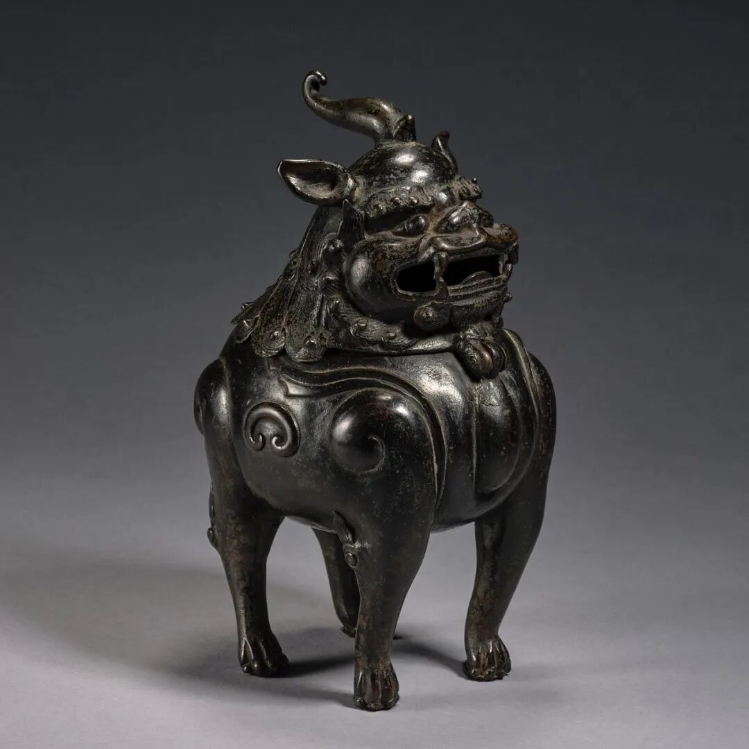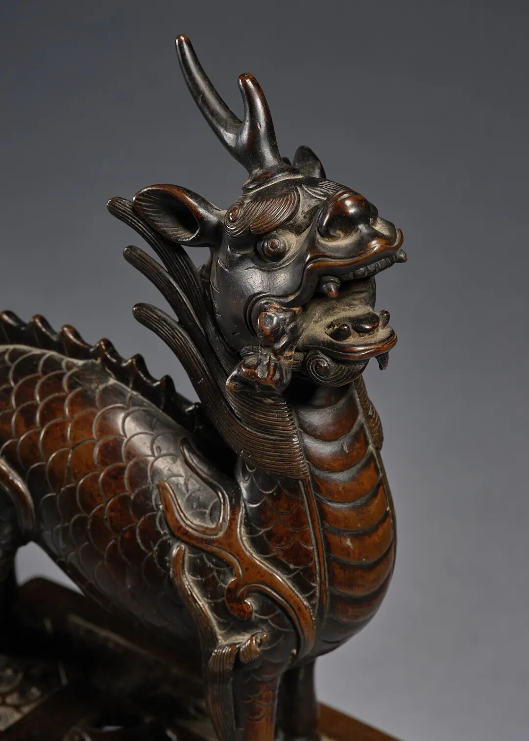 中国古代常仿各种瑞兽制成香熏,甪端即为其中重要的一种。甪端为中国古代传说中的神异之兽,头生一角是其形象最大特征。此件甪端香熏铜质厚重,造型大方,体态健硕,气宇不凡。四足踞地有力,昂首傲立,双目圆瞪,气势威严。大口怒张,以便香气飘散。身披火云甲,胸前饰有璎珞和铃铛,尾部作火焰状上翘,翻卷自然。如意形独角上翘,髮须卷曲盘于脑后,余髮自然散落于前胸和后背,髮丝雕刻精细,丝丝毕现。头部与身体可以自由分合,严丝合缝,构思极为精巧。整器制作精细,品相完好,实为同类器物中的佳品。