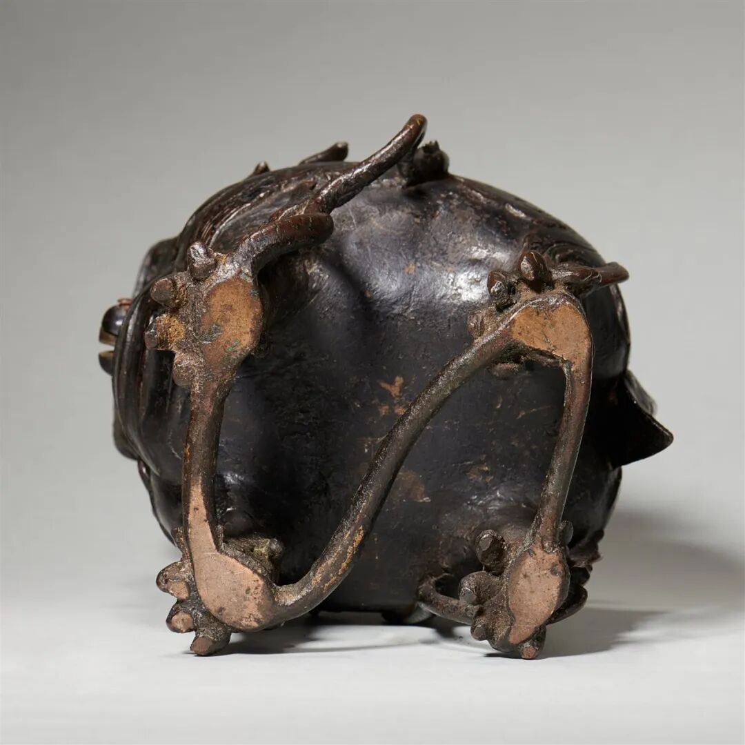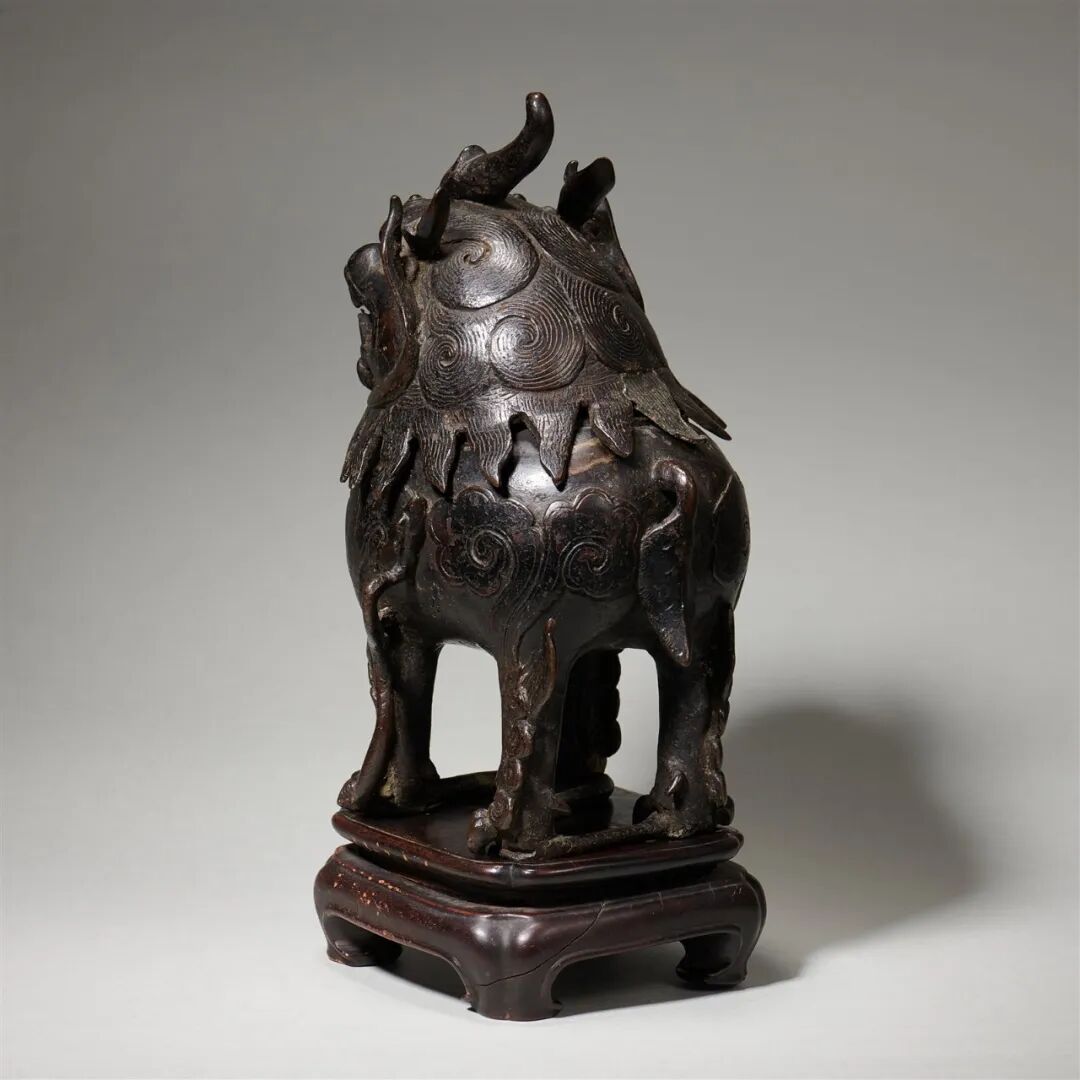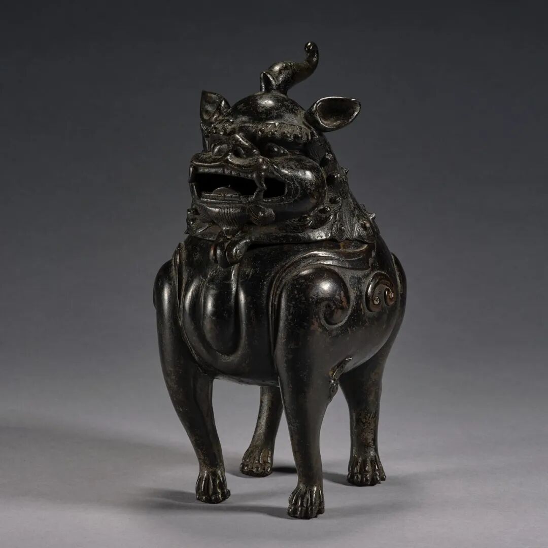 中国古代常仿各种瑞兽制成香熏,甪端即为其中重要的一种。甪端为中国古代传说中的神异之兽,头生一角是其形象最大特征。此件甪端香熏铜质厚重,造型大方,体态健硕,气宇不凡。四足踞地有力,昂首傲立,双目圆瞪,气势威严。大口怒张,以便香气飘散。身披火云甲,胸前饰有璎珞和铃铛,尾部作火焰状上翘,翻卷自然。如意形独角上翘,髮须卷曲盘于脑后,余髮自然散落于前胸和后背,髮丝雕刻精细,丝丝毕现。头部与身体可以自由分合,严丝合缝,构思极为精巧。整器制作精细,品相完好,实为同类器物中的佳品。