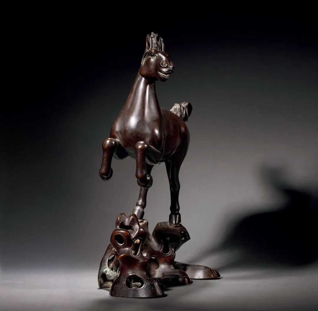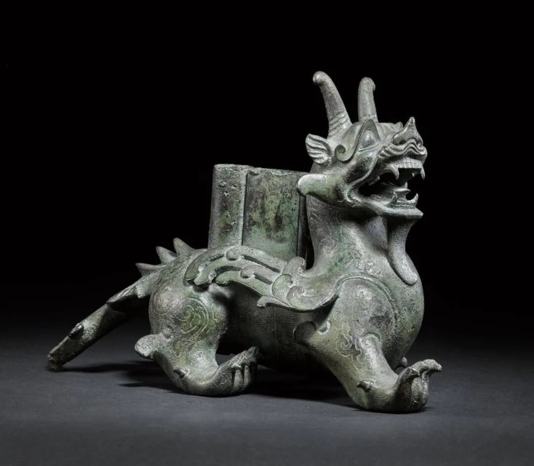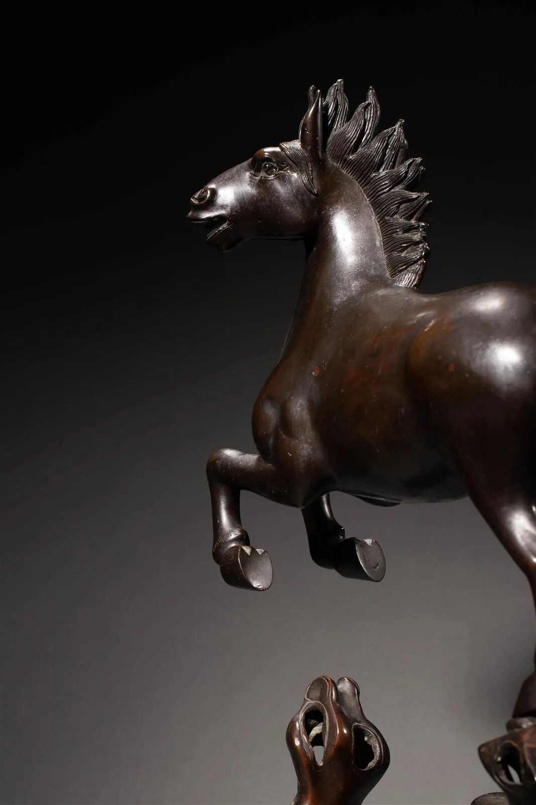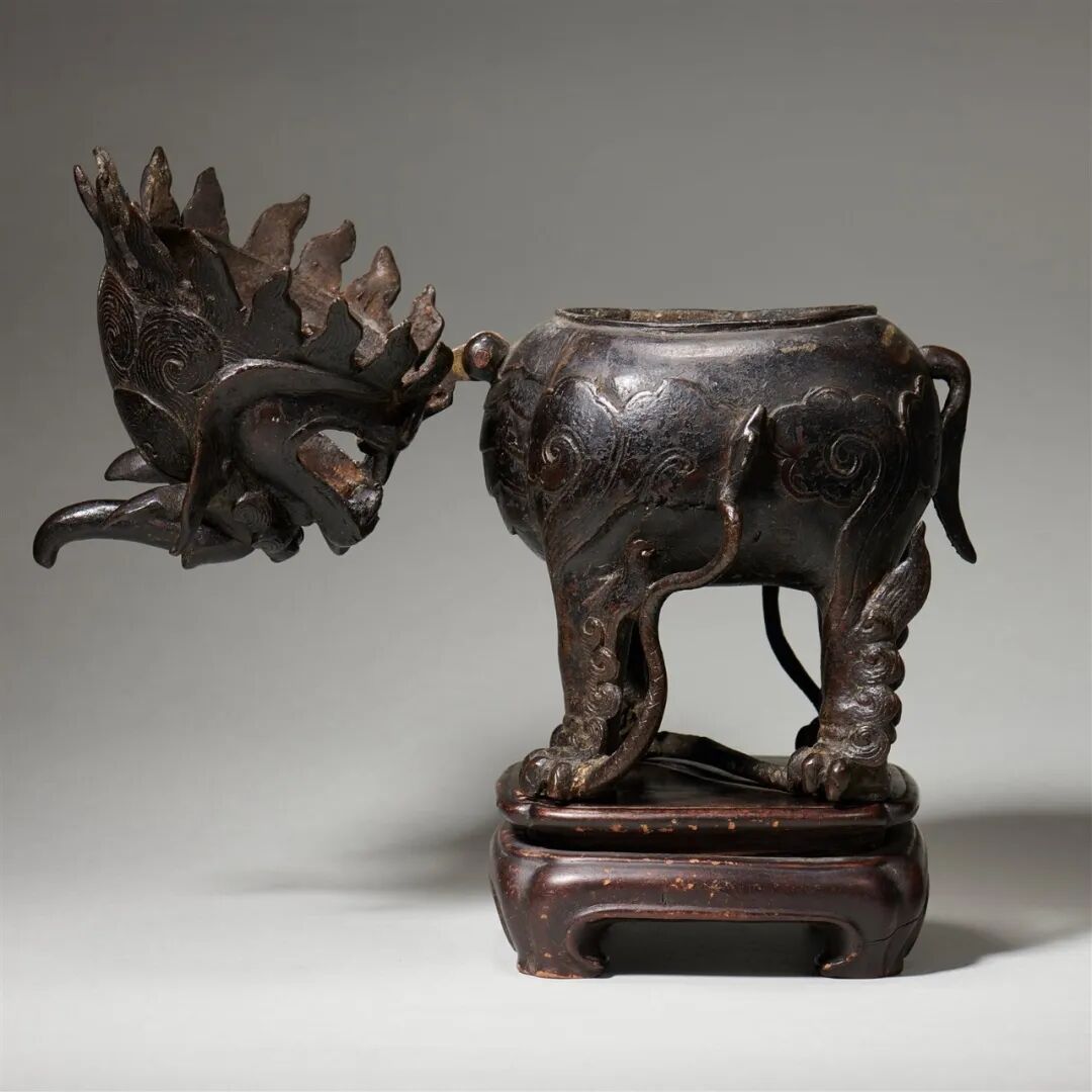 中国古代常仿各种瑞兽制成香熏,甪端即为其中重要的一种。甪端为中国古代传说中的神异之兽,头生一角是其形象最大特征。此件甪端香熏铜质厚重,造型大方,体态健硕,气宇不凡。四足踞地有力,昂首傲立,双目圆瞪,气势威严。大口怒张,以便香气飘散。身披火云甲,胸前饰有璎珞和铃铛,尾部作火焰状上翘,翻卷自然。如意形独角上翘,髮须卷曲盘于脑后,余髮自然散落于前胸和后背,髮丝雕刻精细,丝丝毕现。头部与身体可以自由分合,严丝合缝,构思极为精巧。整器制作精细,品相完好,实为同类器物中的佳品。