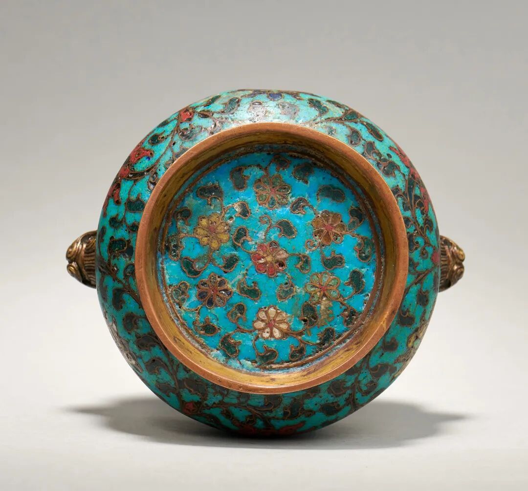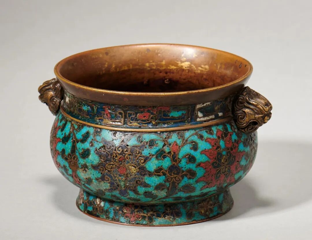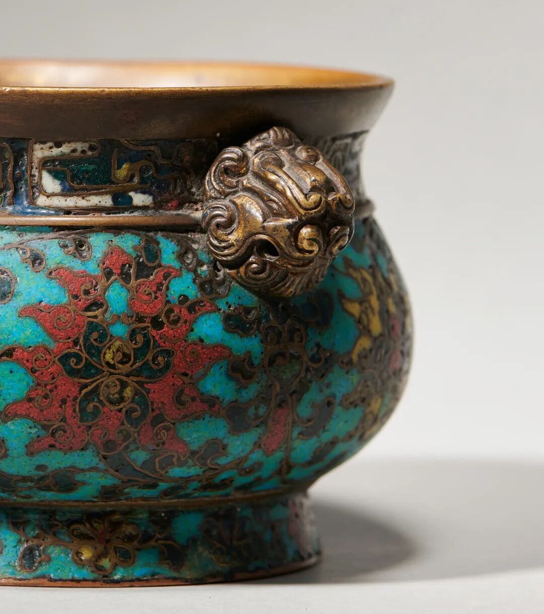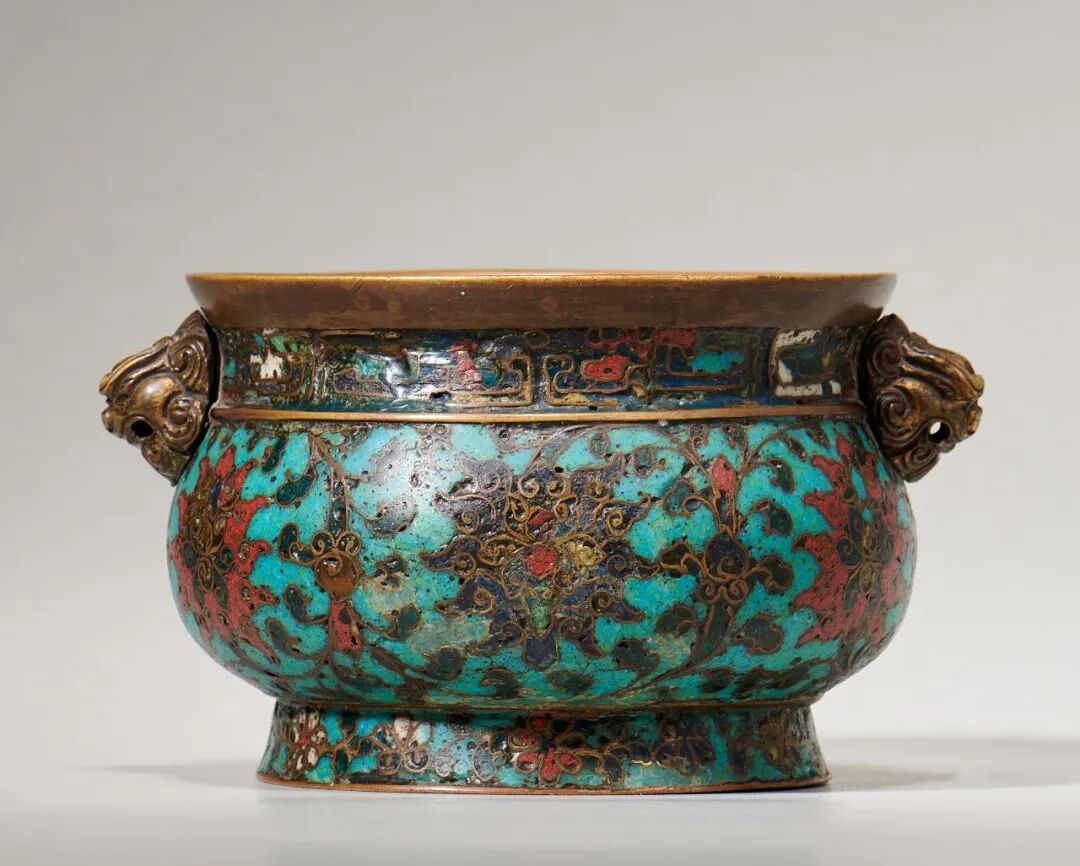 此件双狮耳炉,铜胎掐丝珐琅制,侈口,弧腹,外撇圈足,两侧附狮耳铺首,器形系仿商周青铜器中簋的形制,器表蓝釉地饰宝相花。整器采用掐丝珐琅加以装饰,唇部铜胎,颈部施加一周夔龙纹。珐琅料颈、肩、腹均以天蓝色为地,施绘花卉纹。两狮耳保留铜色鎏金,面部巨大而夸张,狮首毫发毕现,凸目宽鼻,额头凸出,威风凛凛,装饰性很强,给人以强烈的视觉冲击。整器色彩妍丽堂皇,丰富多彩,釉色纯正、洁净,将绘画艺术与珐琅工艺完美结合,掐丝的技术极为娴熟,填涂严谨细致,粗细均匀而流畅,器表打磨光滑,明代保存至今,甚为难得。参阅:《故宫博物院藏品大系:珐琅器编 2》第 92 页。