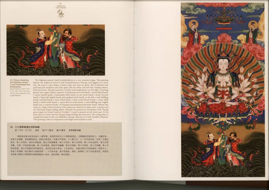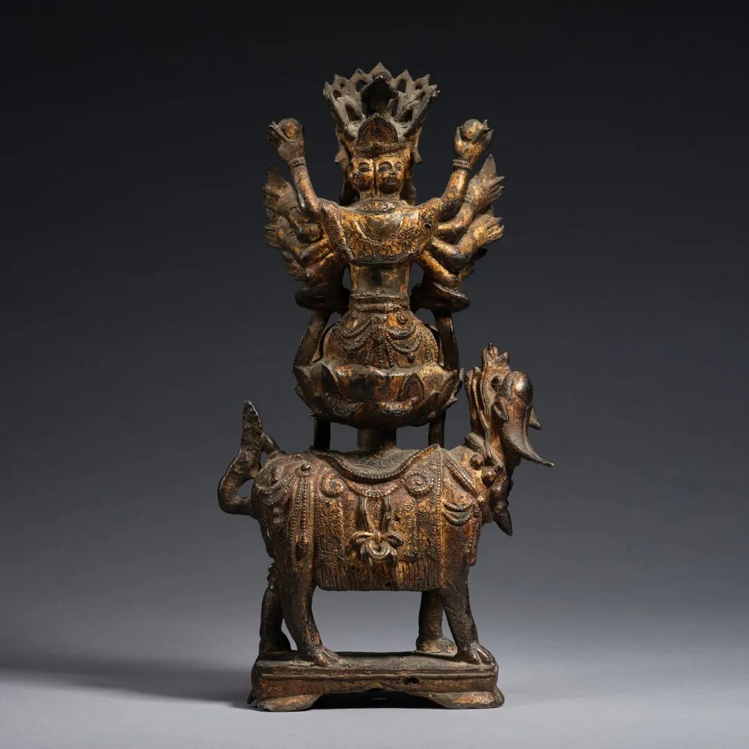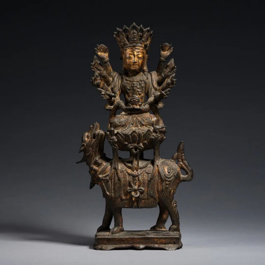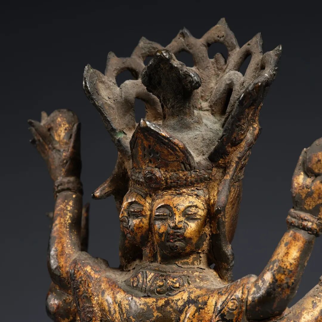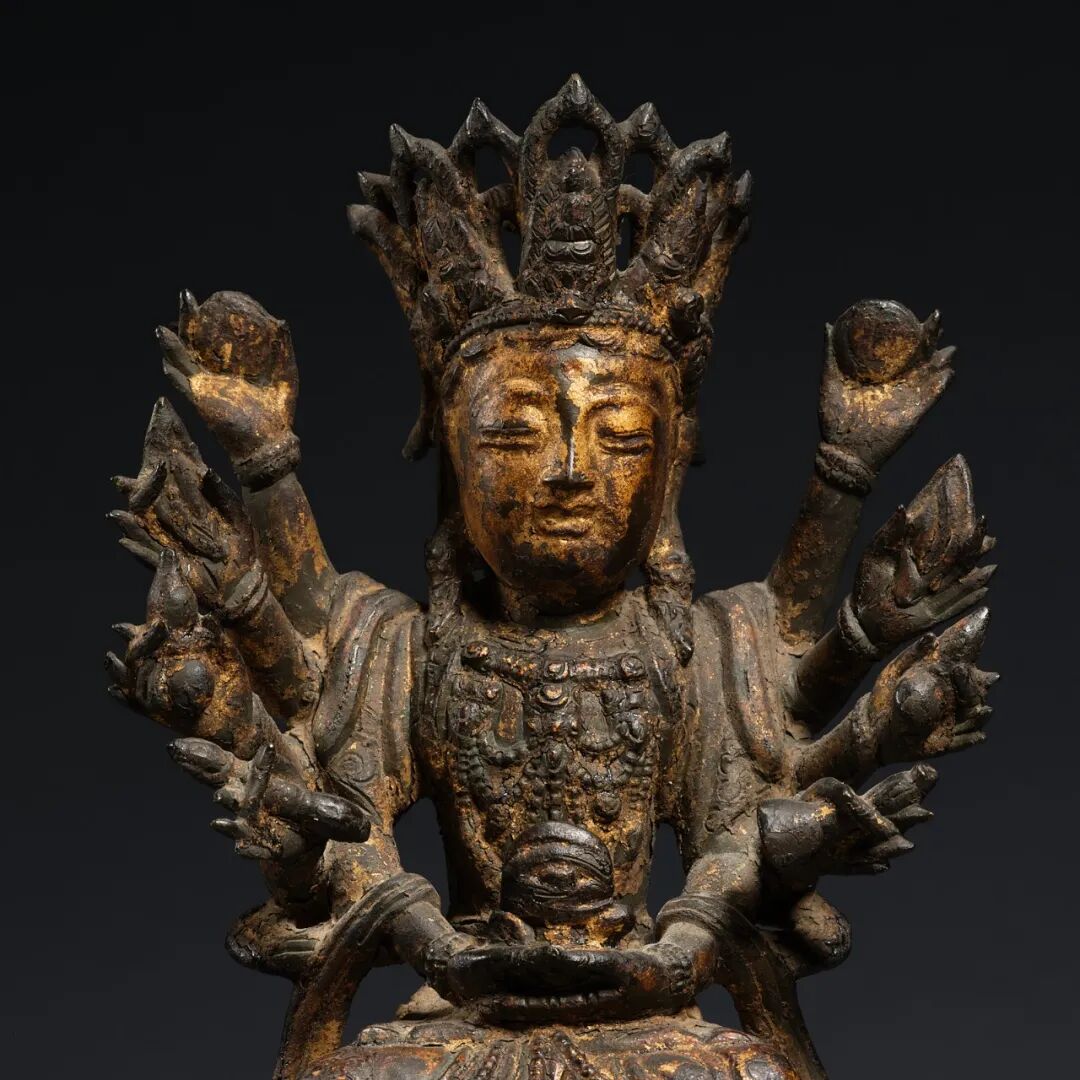 此尊佛母通体漆金,头戴毗楞伽摩尼妙宝,以为天冠,束发高髻,发分多股垂于肩上,耳际宝缯飞扬。圆脸丰颐,眉细如弯月,面生三目,鼻梁高挺,嘴角上扬微露笑容,展露佛教无边的慈悲胸怀,和对众生无私的怜悯。胸前饰项圈璎珞,上身双肩搭帔帛,帔帛在两手腕间分别绕成半圆环,垂搭腿部两侧。下身着天衣长裙,腰间束带,线条清晰流畅,做工规整,艺术感强。胸前的二手作说法相,余臂手中持有莲花、利剑、绢索法器等。结跏趺端坐于三层的仰莲莲座之上,莲瓣错落相间,层层分明。下呈观音坐骑朝天吼,为龙生九子之一。此尊别具一格,坐骑吼四足着地,四肢粗壮有力,肌、肉感明显,吼头刻划细腻饱满,威猛雄壮。参阅:《中国古代观音菩萨》第 131 页、铜泥金准提菩萨。