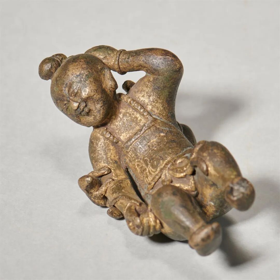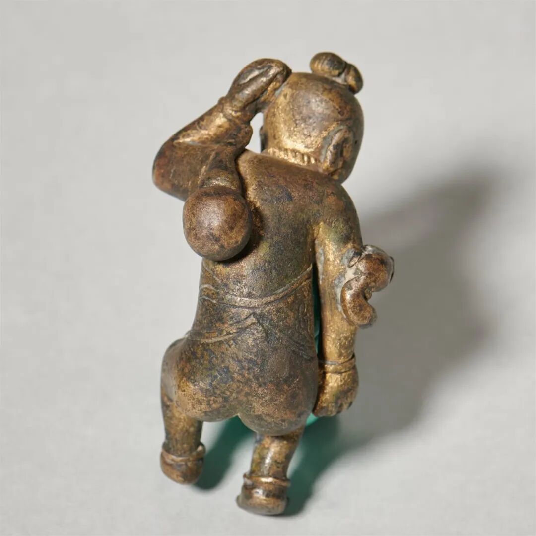 儿童,天真稚气,活泼可爱,具有健康和自然之美,是生命活力的象征。在历史长河中,与儿童相关的艺术品层出不穷,宋代以降尤为盛行,儿童作为独立形象大量出现在不同的艺术形式上,如绘画、陶瓷、玉器、铜镜、石刻、砖雕等,而金铜造像也是其重要的表现形式。此件童子像头部小巧浑圆,头顶束发髻,眼睛细长,阔鼻小嘴,笑意盈盈,形象生动可爱。身着小肚兜,腰间束带,肚兜上阴刻缠枝莲纹饰,手足戴有钏镯。右手持葫芦置于脑后,左手半握拳垂于体侧,呈弓腰屈膝状。一只小猴子攀附在其左臂,似在与童子嬉闹,增添了童趣和意趣。葫芦寓意福禄,猴子寓意富贵,葫芦与猴子结合具有家宅平安,子孙昌盛,多子多福的美好寓意。整像造型完美,刻画惟妙惟肖,无论造型还是表现题材都具有宋代艺术特点,堪为闲暇把玩、案头陈设的佳品。