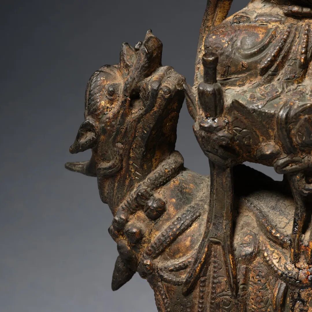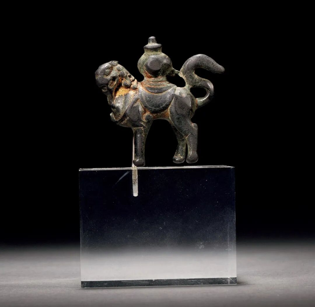 狮子在佛教中多为佛或菩萨的坐骑,是佛教的吉祥物,因其形象威武,有辟邪之作用,是护身镇宅的神兽。此件器物由狮子和宝瓶两部分组成,狮谐音“事”,瓶与“平”同音,可见狮驮宝瓶即有事事平安的美好寓意。狮子双耳耸立,双目圆睁,阔口大张;唇下鬃毛垂胸,头后鬃毛卷曲披于背后;颈部系有项圈,背部配有鞍鞯,鞍鞯上置有六棱宝瓶;右前足高抬,呈屈膝状,其余三足呈直立状,富于动感;尾部呈S型卷曲上翘。整体造型夸张,形象威猛,风格古朴,颇具中原地区早期造型艺术特点和韵味;加之寓意美好,流传有序,十分难得。堪为案头摆放和闲时把玩的不二之选。