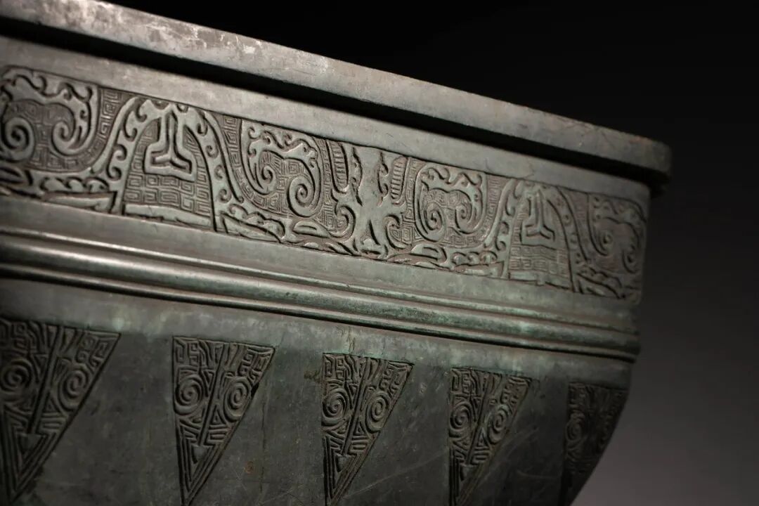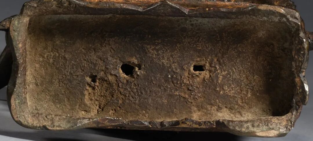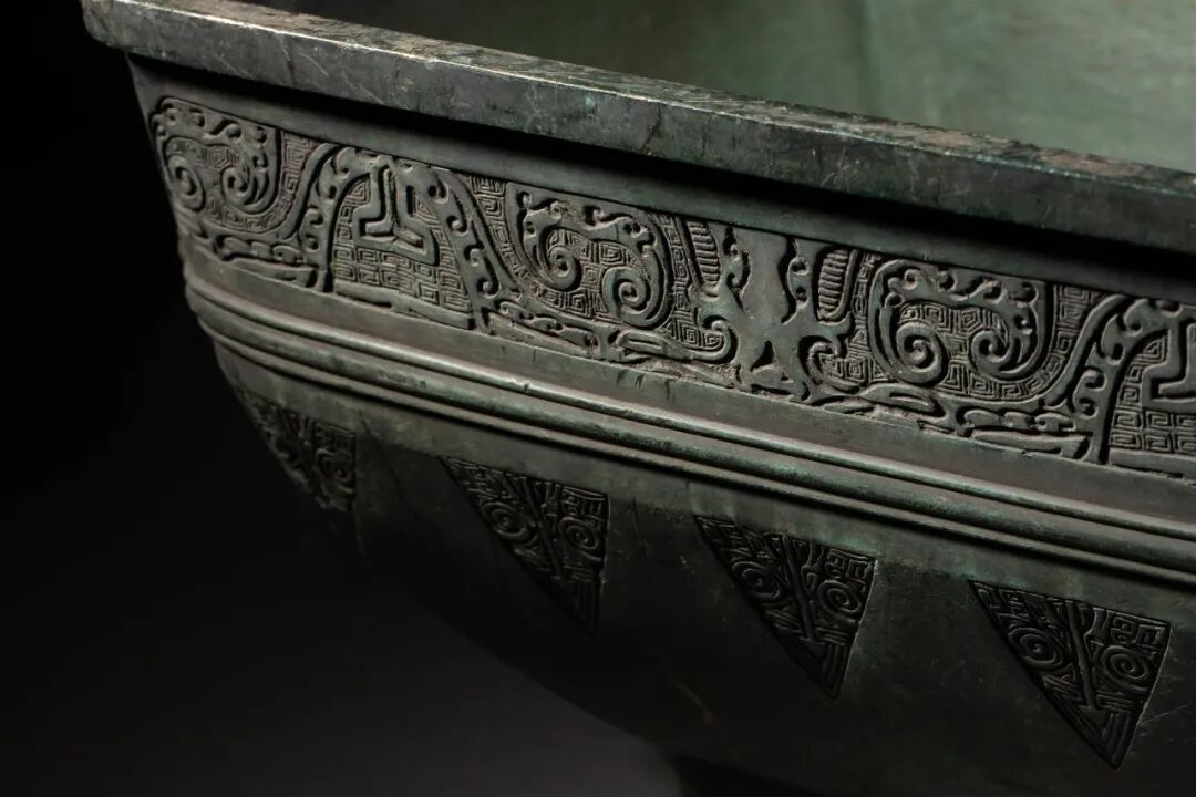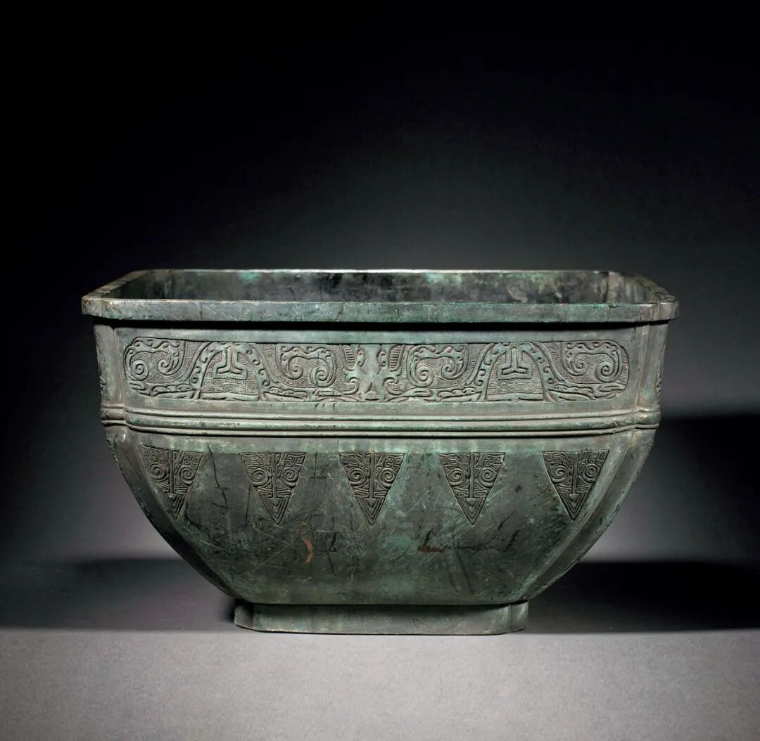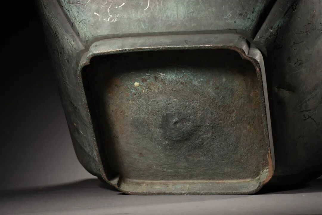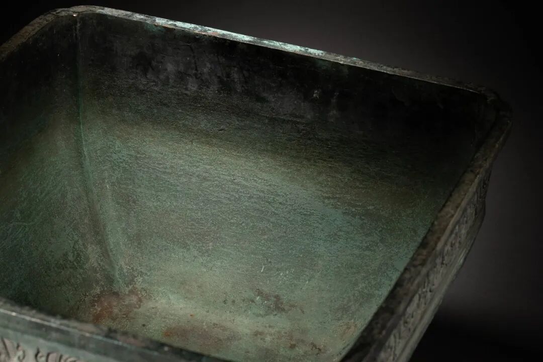 此件方斗呈正方形,上敞下敛,中间以凸起的线条刻画出腰线,同时分隔出上下两部分,上下分别浮雕不同图案。其中,上方雕刻一周饕餮纹和兽面纹;下方雕刻一周蕉叶纹,蕉叶内又饰以夔龙纹,夔龙蜷曲盘绕,两两相对。最下方为四方器足。整体造型周正,简洁大方,纹饰精美,刀工深邃,仿古韵味浓郁;加之体量硕大,铜质精良,胎体厚重,包浆醇厚,是一件难得的清代仿古珍品。斗在中国古代有财富和才能的象征意义,至今仍流行“日进斗金”“才高八斗”的成语故事,可见若家中摆放一斗,寓意可谓十分美好。