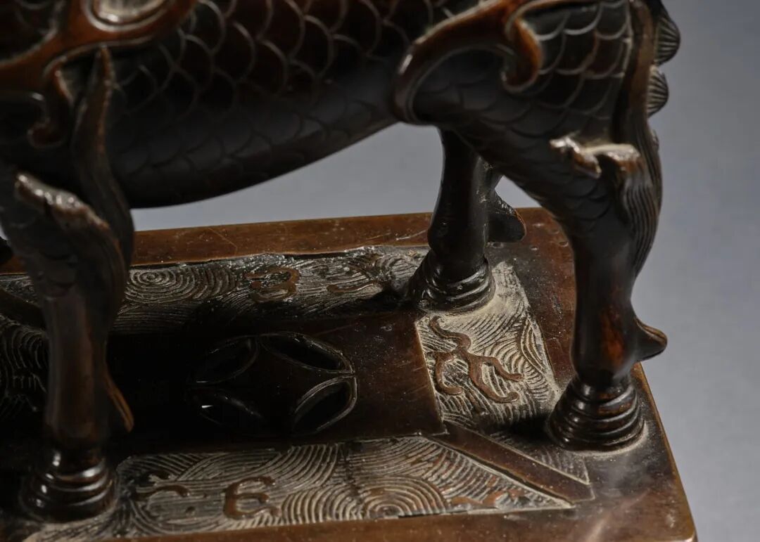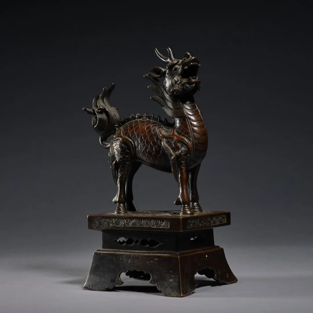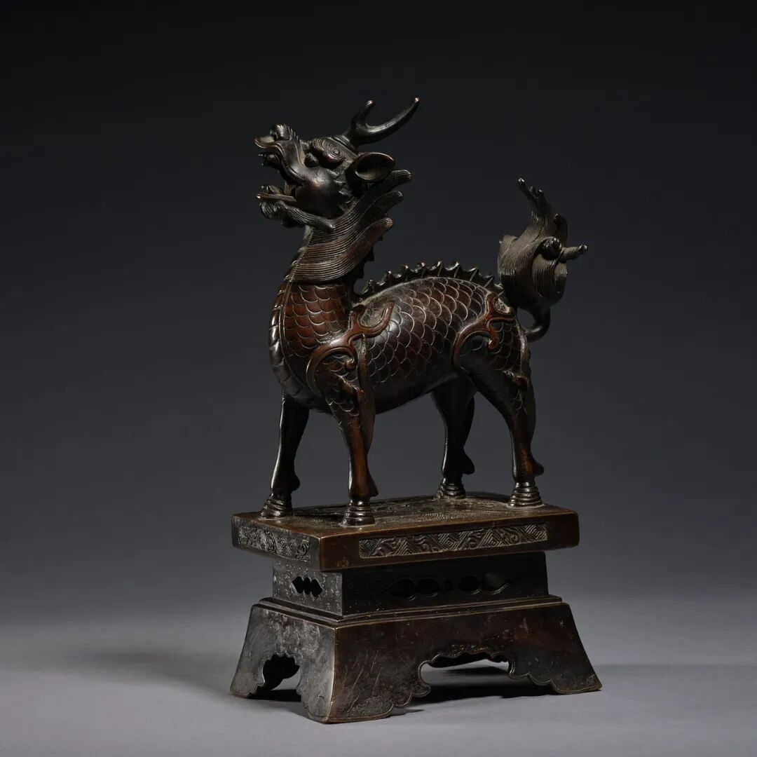 此件铜制麒麟摆件,身形矫健,身布鳞片状表皮,兽首高昂,头顶生独角,双耳竖立,圆眼怒瞪似铜铃,开口露齿,颈部、四肢鬃毛浓密厚重,背鳍戟张,肋下火焰迎风飘扬,狮尾上翘,四肢如马,踩踏须弥式台座。麒麟,是中国古籍中记载的一种动物,与凤、龟、龙共称为“四灵”,是神的坐骑,古人把麒麟当作仁兽﹑瑞兽。雄性称麒,雌性称麟。在古代社会麒麟的形象被广泛应用于艺术的各个领域,更是受到底层百姓的喜爱与推崇。