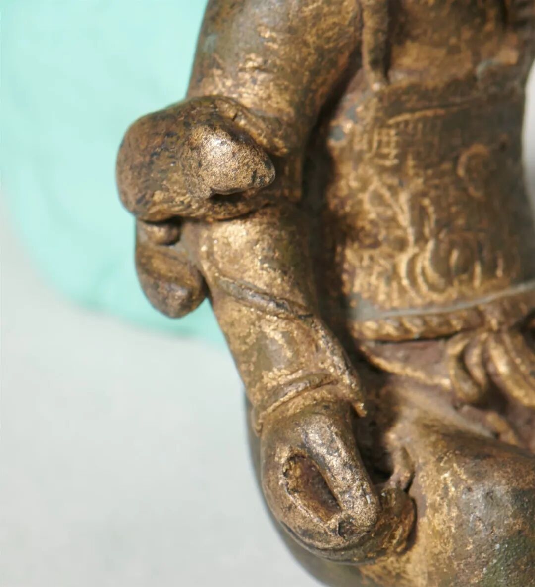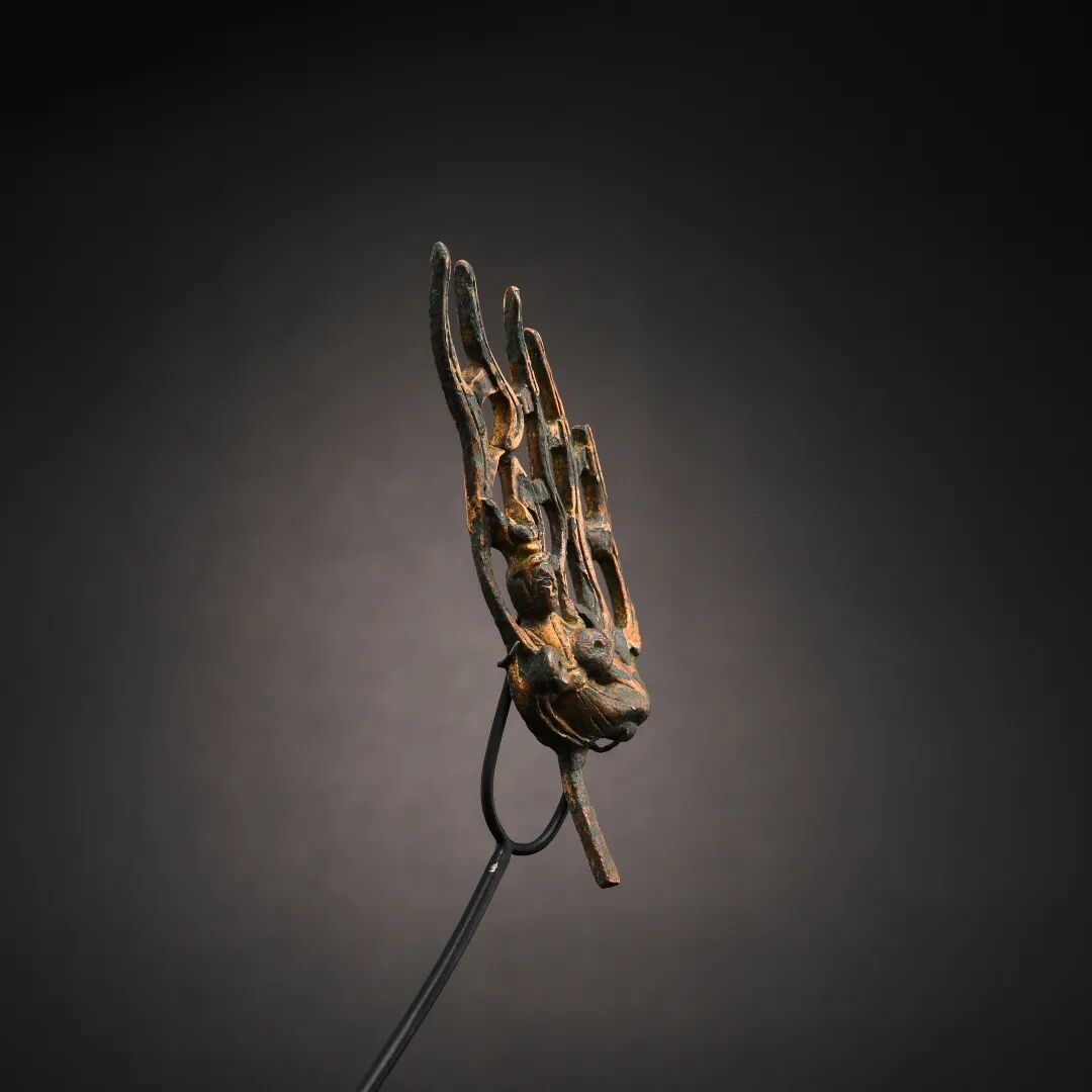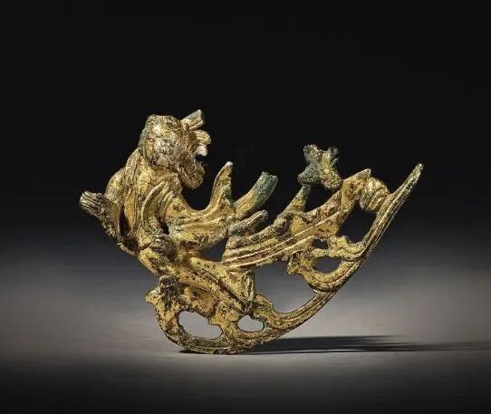 此像表现的是一尊飞天造像。飞天像在北朝晚期的石雕和金铜造像上比较多见,一般出现在佛像的背光上,成组出现,左右对称,背光的顶部位置有一个佛塔。此尊飞天像双手持乐器“钹”,属于飞天的一种,应当称为伎乐天,代表以音乐供佛。飞天的面部和躯体交代得非常清晰,雕刻精细。身上所披的飘带飘向身后,随风飘扬,刻画得非常生动。上身着交领式衣袍,腰间束带,下身着长裙,双腿呈弯曲状飘于空中。衣纹采用阴刻线条表现,刀工深邃,粗犷有力,具有北朝晚期雕刻技法的鲜明特征。身下有一个长榫,应为当时固定背光所用。整体形象质朴淳厚,风格古朴凝重,与唐代飞天妩媚的形态和妖娆的动感相比,别有一番韵味。相似造型可参考美国大都会博物馆藏北魏正光五年(524年)牛猷造铜镀金弥勒佛立像身后背光上飞天像,2021年香港苏富比秋季拍卖会“佛教文物”专场第3506号的铜鎏金飞天像。特别值得注意的是,这尊飞天像虽然是一个配件,但是它的造型非常完整,鎏金完好,完全可以视作一尊精美的雕塑作品。从体量上看,它原来装配的背光应该非常大,能够保存至今非常难得,具有非常重要的研究和收藏价值。