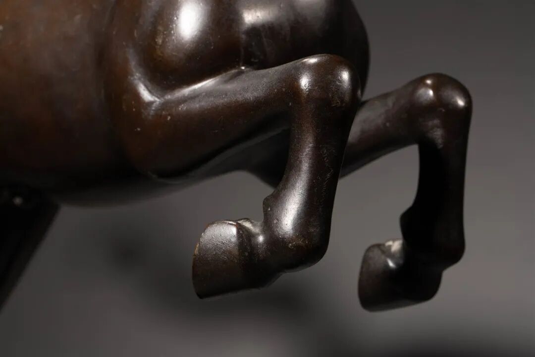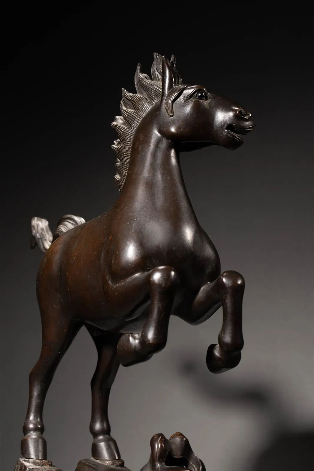 马是一种草食性动物,大约4000年前它被人类驯服后,在古代农业生产、交通运输和军事等活动中发挥了重要作用。而在古代中国,它除了具有实际作用外,还被赋予了丰富的象征意义。首先它象征自强不息、奋斗不止的精神,如人们常以龙马精神喻指中华民族自古以来所崇尚的积极向上的民族精神;其次它象征能力、圣贤、人才,如古人常以千里马来比拟难得和有能力的人才,千里马是日行千里的优秀骏马;再者它象征忠诚,因为马是人类最忠实可靠的朋友,历史上留下了许多关于马为主人赤胆忠心、累死沙场的佳话。因此之故,马在中国古代成为了艺术家创作的重要题材,至今留下了大量珍贵作品,其中1969年出土于甘肃省武威市雷台墓的东汉“铜奔马”(又称“马踏飞燕”),是古代奔马作品中的最杰出代表。这件铜奔马身躯刚健饱满,头顶鬓毛飞扬,神采潇洒骏逸,凸显了奔马的优良品质和威武雄姿。它昂首扬尾,张口嘶鸣,前两足腾空,后两足踏在嶙峋的山石上,表现了向前跨越的瞬间动作。整体造型生动,构思巧妙,将奔马的奔腾不羁之势与平实稳定的力学结构融为一体,展现了蓬勃旺盛的生命力量和一往无前的豪迈气势,具有激发人们奋发向上,大展宏图,战胜一切艰难险阻的积极美好寓意。