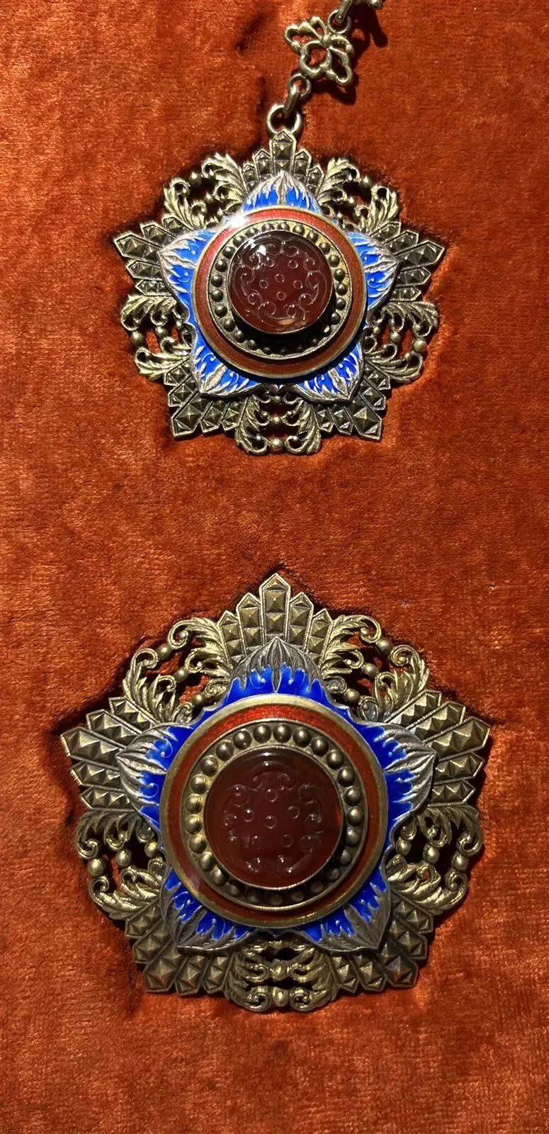 银鎏金镶珐琅,整体采用银质珐琅镀金多层结构,中心镶嵌了镌刻着五福图的圆形玛瑙,背为“国民政府文官处印铸局制”及篆书“采玉勋章”,编号:110,附绶带及原盒,全套保存完好者稀见