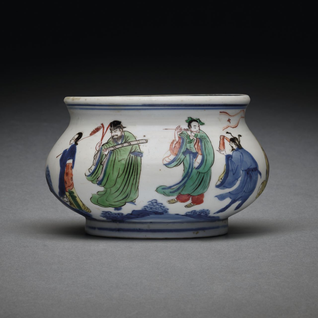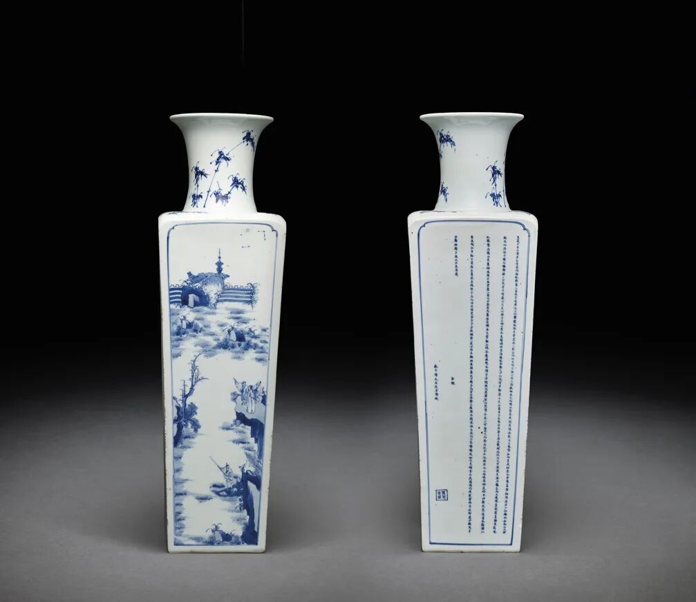 自1965年起,巴特勒爵士特地编制了一份注解甚详的购藏与处置明细,对于研究其收藏史的当代学者来说,不啻如虎添翼。当中所含的重要信息,以及大量的辅助研究及源流始末,皆收录于巴特勒爵士小女儿巴芙莲 (Katharine Butler) 及学者甘淑美 (Teresa Canepa) 为巴特勒家族珍藏出版的精采图录。此次拍卖萃选的巴特勒家族珍藏,彰显了十七世纪瓷器的若干重要特征。以品相一流的青花通景访贤图香炉为例,此器烧造于明崇祯 (公元1628至1644年) 年间,当时御窑虽已停烧,但其青料翠艷幽深,正是晚明上等瓷器的特色。本香炉的画工亦格外精湛,器身通绘叙事场景,既引证了历史、文学和传奇主题何等流行,亦反映了木刻插图的影响何其深远。本拍品以姜子牙 (亦名姜太公) 会周文王 (公元前1100至1050年在位) 为题。根据1550年代初版明代小说《封神演义》,主角之一姜子牙为韬略家。他原忠心事商,但因亡国之君商纣荒淫暴虐,遂佯疯引退。迁居周境后,他终日怡然垂钓渭水之滨,或用直钩,或干脆无钩,称之为“愿者上钩”。同样道理,他亦深信贤德之君定能不请自来,与之合力推翻腐败的商室。周文王凭卦象提供的线索,终于找到了河边垂钓的姜子牙。《太公六韬》位列中国《武经七书》之一,据说其纲要正是周文王与姜子牙的对答。姜太公曾任文王丞相,后辅佐其子武王,是周文王死后助武王克殷立国的一大功臣。巴特勒爵士偏爱搜集带款识的瓷器,具年代款和题经典诗文者均属此列。证诸本季精选藏品,前者有画工一流的小巧五彩八仙图香炉,其器身署纪年款“康熙丙子年(即公元1696年)汪以仁置”。这一香炉曾多次展出,包括重量级展览《上海博物馆与英国巴特勒家族所藏十七世纪景德镇瓷器》,该活动凝聚了巴特勒爵士与已故著名学者暨上海博物馆副馆长汪庆正 (1931至2005年) 的心血和努力。本季呈献的康熙 (公元1662至1722年) 青花“赤壁赋”方瓶,正是题有诗文的经典之作。![]()