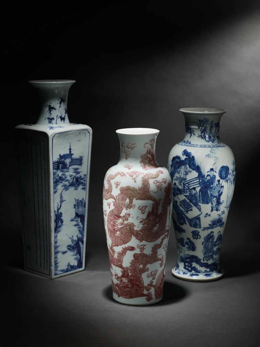 此瓶外壁饰以宋代文人苏轼 (又名苏东坡,公元1037至1101年) 的名篇《赤壁赋》全文及相关的场景。赋中描述的是苏轼于1082年与友人同游赤壁之经过,公元208年冬,汉代大规模水上战役“赤壁之战”便是在此上演。精选藏品中也有一些绘披麻皴山水图的例子,这一表现手法源远流长且论述颇丰;除此之外,拍品中的康熙釉里红九龙纹观音尊亦恢宏大气,其九龙题材祯祥之至。器身九龙虬曲盘旋,其中八者为左右相向的双龙,器颈一龙作戏珠状。相传看守天门的正是九龙,而龙本身象征阳气。估价:港元 800,000 - 1,200,000“乍眼看来,此尊似乎通体仅绘釉里红纹饰,惟细察之下,便会发现龙的双目是用釉下钴蓝点画而成,具鲜明的康熙时代特征。” 苏玫瑰说。![]()