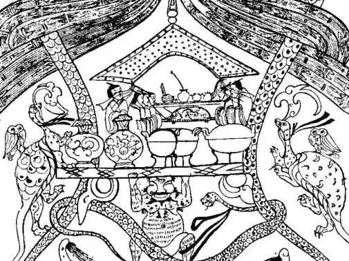 汉鼎在祭祀等礼仪活动中的使用。参见湖南省长沙市西汉马王堆1号墓出土的帛画(线图局部)