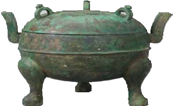 西汉的铜鼎型制,仍与战国相近,如:椭球型的器体,鼎盖上一般为三个环状钮或牺钮,两个附耳,三个兽蹄状的鼎足。西汉铜鼎的体型不大。