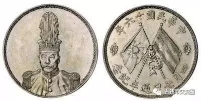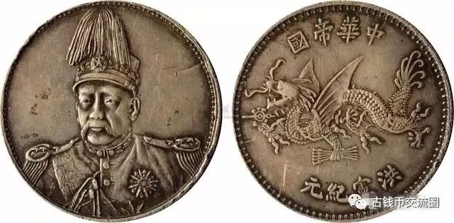 袁像洪宪银币:袁世凯军装正面像,背:中间铸有一条展翅飞龙,上下分环"中华帝国""洪宪纪年"和飞龙签字版。