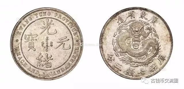3.光绪中期在广东开铸龙洋各省随后纷纷仿造。清光绪十五年即公元1889年由广东开始的,次年流通于市场。这一时期较有代表性的银圆有:“光绪元宝”库平七钱三分,俗称“七三反版”。