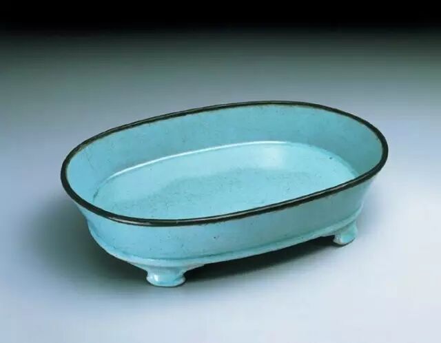 椭圆形盆、侈口、深壁、平底、底足间突出一圈窄边稜、四足、足呈云头形。1936年曾参加伦敦中国艺术国际展览会,编号Porcelain No.26。