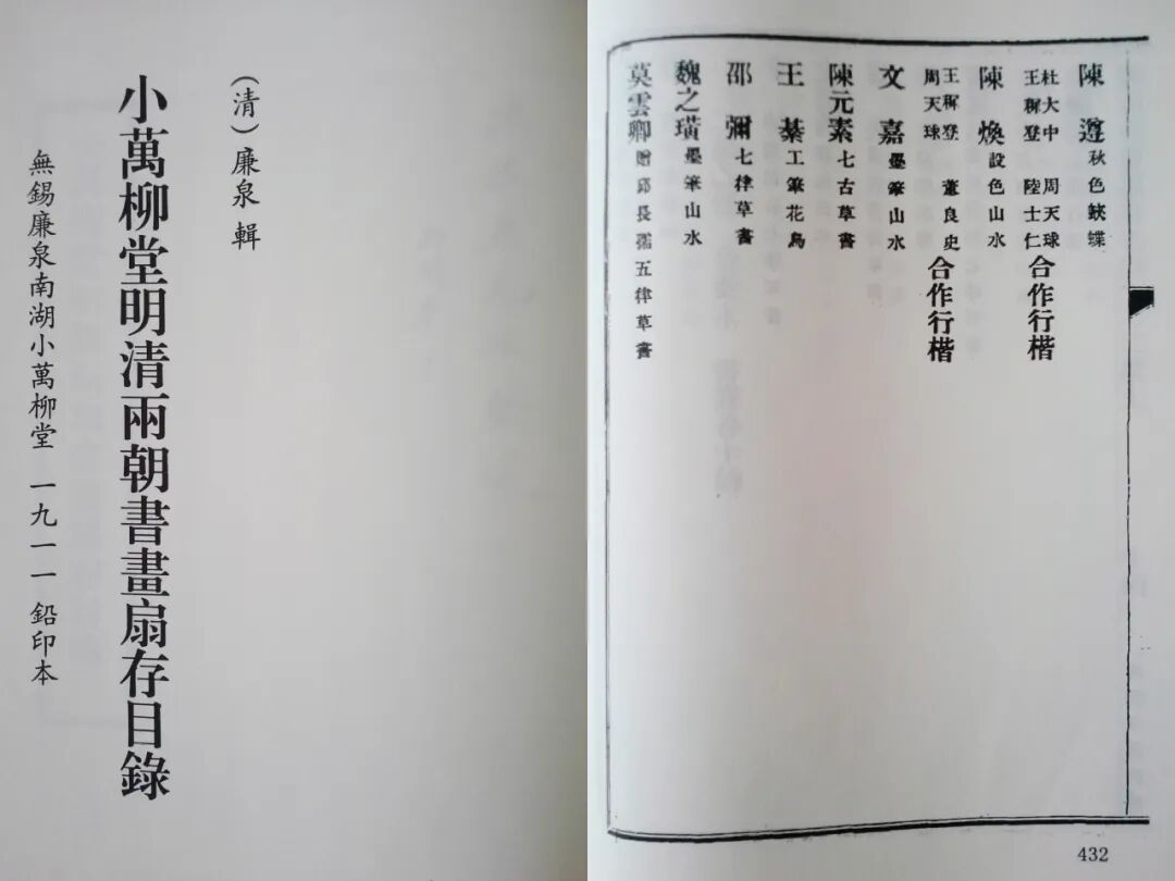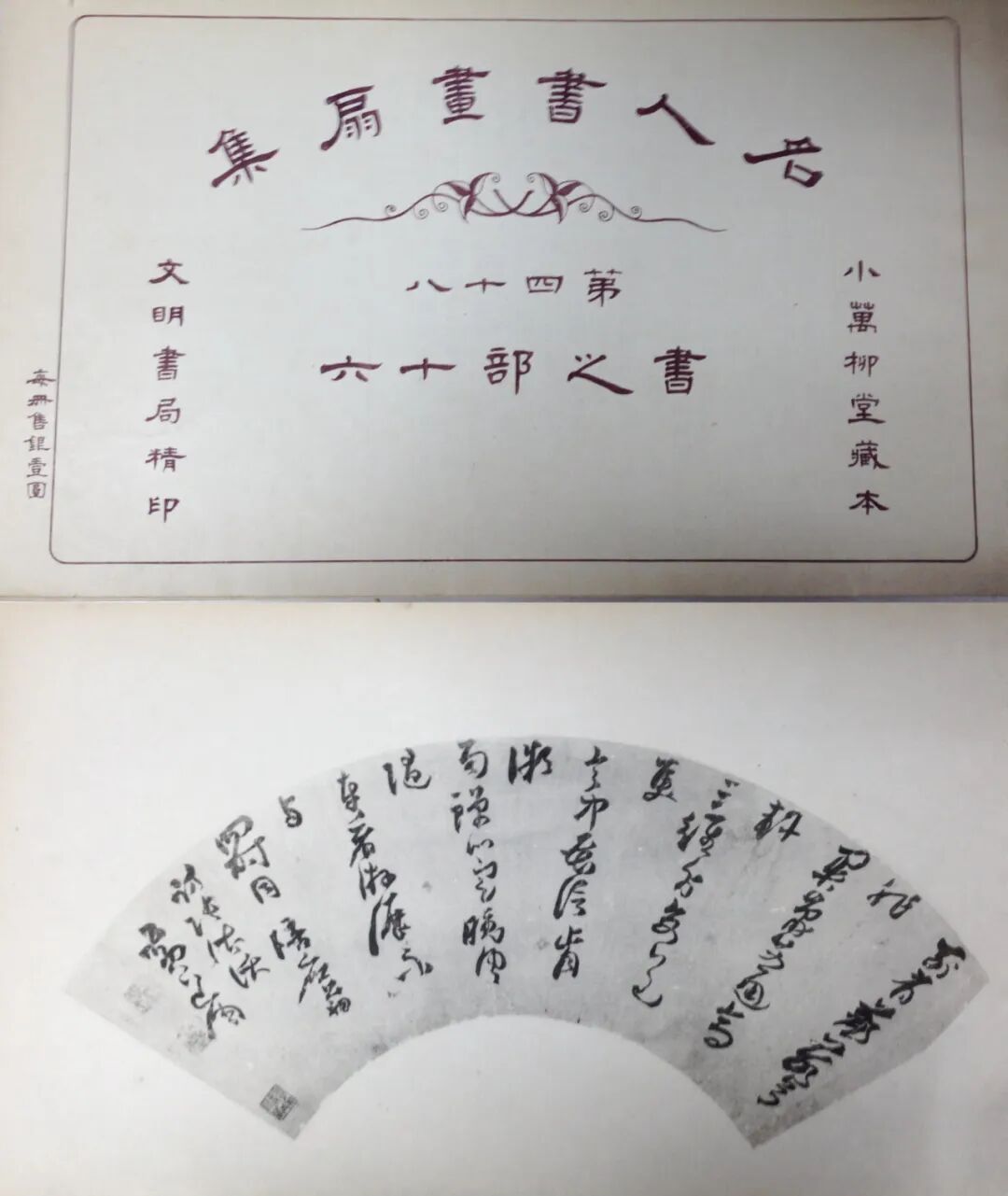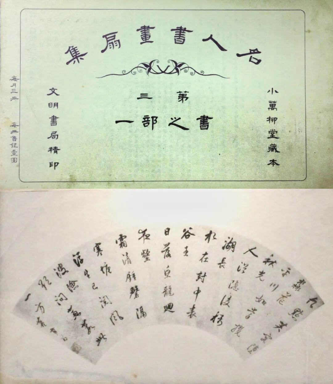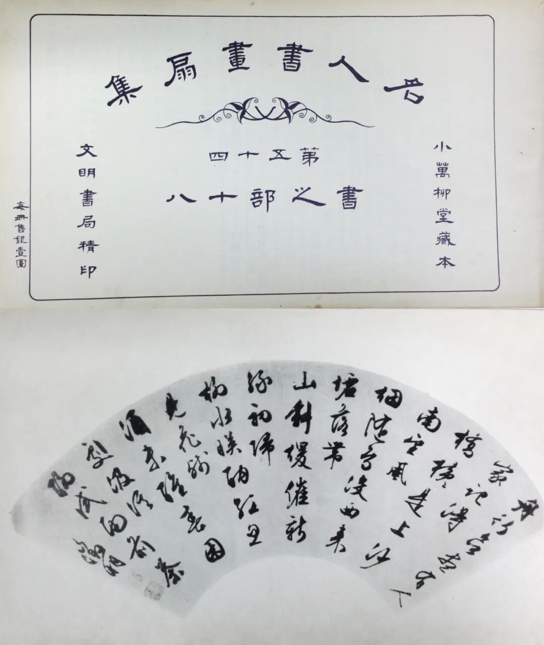 泰州宫本昂与无锡廉泉本为亲戚,又同好收藏书画精品,引为知己。宫氏兄弟用毕生之精力收集搜罗历代名家书画作品,其中对扇面画最为用心,珍藏扇面作品一千余件,并编为《书画扇存》。宫本昂病重时,特将夫人孙婉如叫至床前,叮嘱其说:“我从小别无他好,唯古书画而已。每遇名贤真迹,总是赏玩徘徊,爱不释手。玉甫与我一样,五十年来两人宦游各地,并力搜罗,成此名家扇册六集,我们兄弟的精神全部寄托其中。我死后把扇册传于廉氏,藏之小万柳堂,也许不负我兄弟毕生搜集之苦心。”说罢,他嘱咐家人将扇册装入十二个书箱,亲自上封,并吩咐非廉君至不得启封。宫本昂殁后,廉泉如约购回《书画扇存》。这批明清文人书画扇面共一千零五十三叶,许多扇叶上都钤有“泰州宫氏珍藏”“宫子行同弟玉甫宝之”和“宫子行玉甫共欣赏”的藏印。廉泉得后珍若拱璧,但不秘惜,常与友人鉴赏把玩,告知其来历。一次去日本,还将扇册带往东瀛展览,引起不小的轰动。1911年,廉泉编成《小万柳堂明清两朝书画扇存目录》出版,端方为其作序,并盛赞为“宇宙之奇观”。民国初,廉氏从《书画扇存》一千余叶中,选出精品六百叶,影印成《名人书画扇集》六十册,这也是中国最早使用珂罗版印刷技术印制的画册,这套画册不仅本身极具欣赏价值和收藏价值,更为今人研究明清两代中国文人扇上书法绘画的风潮提供了珍贵的史料。文嘉(1501-1583)作 文彭(1498-1573)题 墨笔山水廉泉辑《小万柳堂明清两朝书画扇存目录》二集乙册,小万柳堂铅印本,1911年。