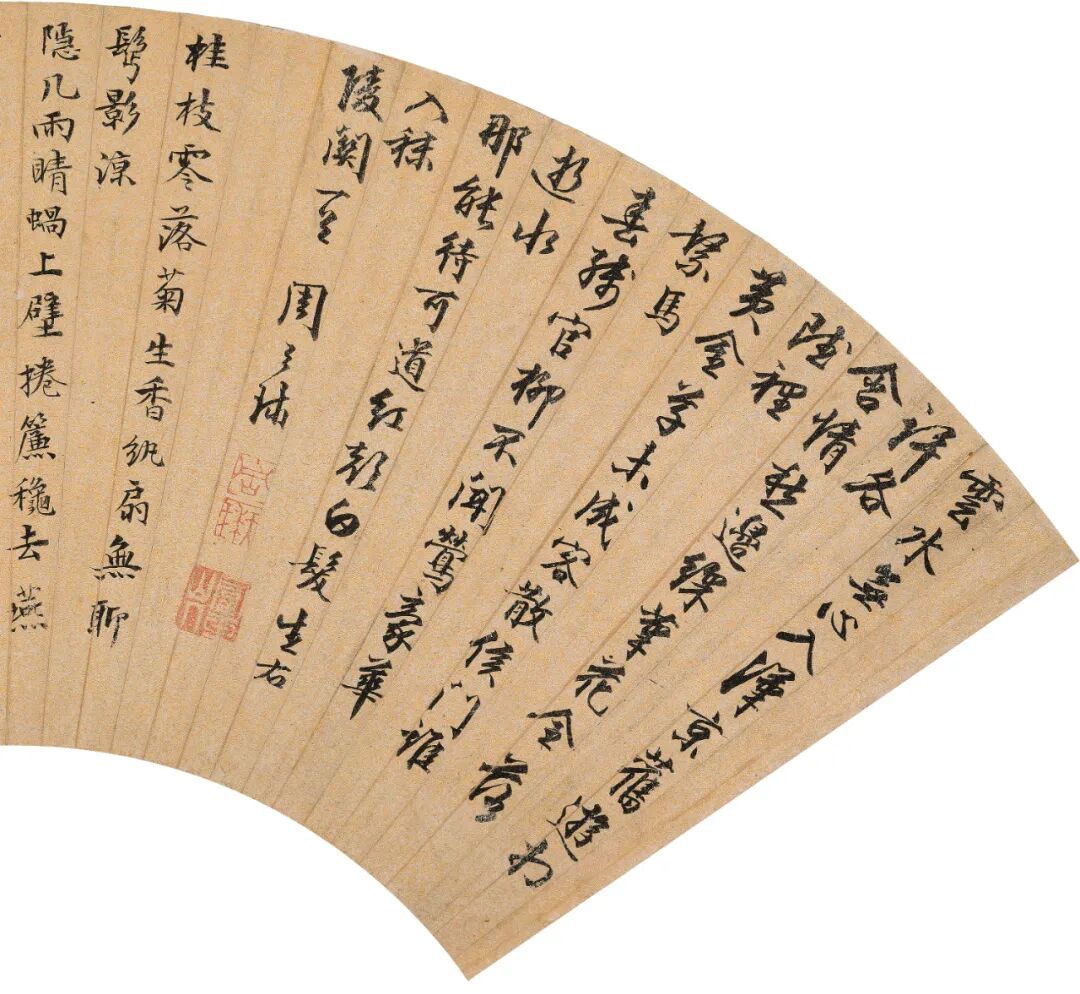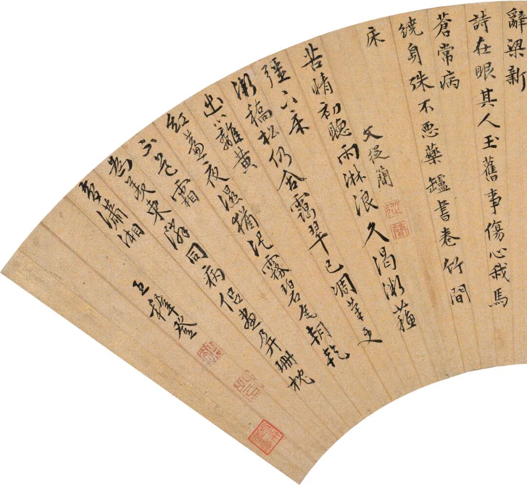 明代中期,书法家普遍地意欲摆脱台阁体书法的束缚。在苏州地区,出现了大批书法名家,开风气之先者有吴宽、王鏊、李应祯、沈周等人,随后是“吴门三家”祝允明、文徵明、王宠,以及唐寅、陈淳、文彭、文嘉等书法家,他们力矫台阁体之弊,重倡帖学书法本义,形成了占据书坛主流地位的吴门书法。文徵明绘画成就既高,书法亦精,初师李应祯,后广泛学习前代名迹,篆、隶、楷、行、草各有造诣。尤擅长行书和小楷,温润秀劲,法度谨严而意态生动。他的书法从五十到六十岁形成齐整劲健的书风,深得二王、智永、黄庭坚等法家遗意。王世贞说“余尝谓吴兴赵文敏公孟頫,风流才艺,惟吾郡文待诏徵明可以当之,而亦少有差次其同者”。观此扇,法度严谨,秀丽劲健,是其中晚年习见的书风,而堪称其中精绝者。行笔劲健挺括,转折处有遒劲神力,具巍峨磊落之姿,结体疏密匀称,用笔精老纯熟,笔画间灵动有致,顾盼之情比比皆存,似得冰姿玉质之神韵。