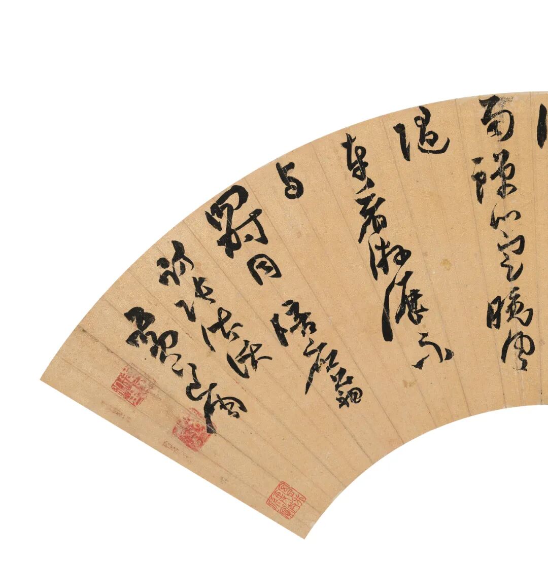 周天球、文从简、王稺登皆为吴门派名家,直接受教于文徵明。周天球(1514-1595),太仓人,嘉靖八年(1529)随父迁徙苏州,从文徵明习书,文徵明极许之曰,“他日得吾笔者,周生也”,承其书法,闻名吴中。文从简(1574-1648),苏州人,文徵明曾孙,传承家学,作书温文尔雅。王穉登(1535-1612),苏州人,书法师从文徵明,上追宋元名家如苏轼、黄庭坚等,强调以气势来统辖形式变化的和谐,在个别字上竭尽缭绕曲折之姿态,富于趣味。是扇为虚斋庞元济旧藏,钤“虚斋藏扇”为记。庞元济(1864-1949),字莱臣,号虚斋,浙江吴兴南浔人。父庞云鏳为南浔巨富,“南浔四象”之一。庞氏既拥有财力,又精于鉴赏,收藏有铜器、瓷器、书画、玉器等文物,尤以书画最精,闻声海内,一时罕有其匹,著有《虚斋名画录》16卷、《续虚斋名画录》4卷。![]()