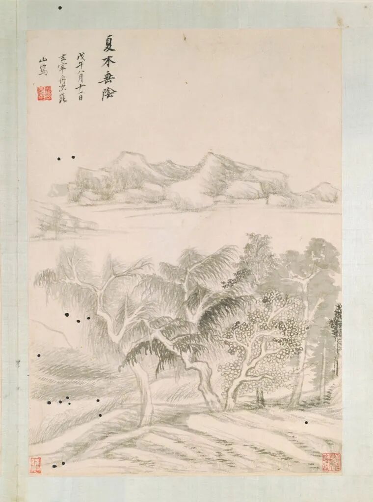 第四开,墨笔。自题:“夏木垂阴。戊午八月十一日,玄宰舟次崑山写。”钤“董其昌印”。鉴藏印钤“男祖源珍藏”、“时敏”。