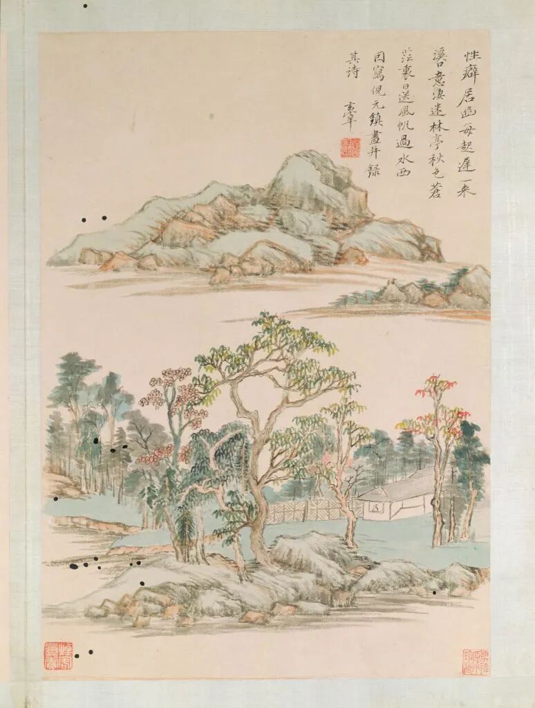 第三开,设色。自题:“性癖居幽每起迟,一来溪口意凄迷。林亭秋色苍茫里,日送风帆过水西。因写倪元镇画,并录其诗。玄宰。”钤“董其昌印”。鉴藏印钤“男祖源珍藏”、“烟客真赏”。