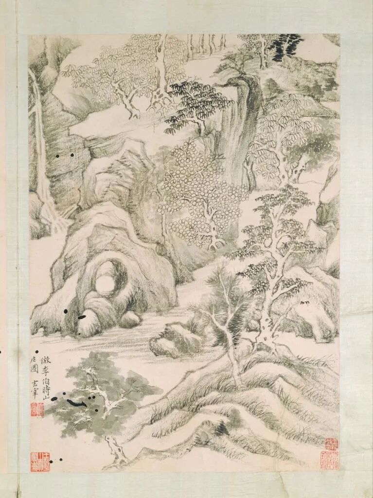 第七开,墨笔。自题:“松岗图。玄宰。”钤“董其昌印”。鉴藏印钤“男祖源珍藏”、“王时敏印”、“臣玕审定”、“藏之名山传之其人”。
