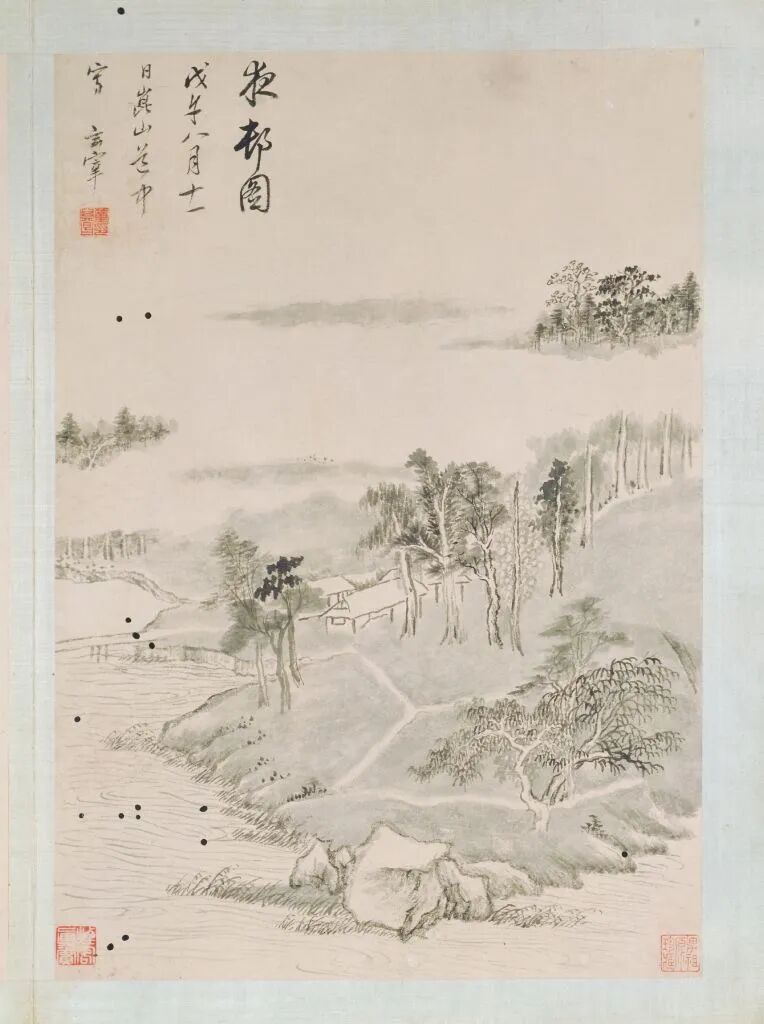 第八开,墨笔。自题:“夜村图。戊午八月十一日崑山道中写。玄宰。”钤“董其昌印”。鉴藏印钤“男祖源珍藏”、“烟客真赏”。