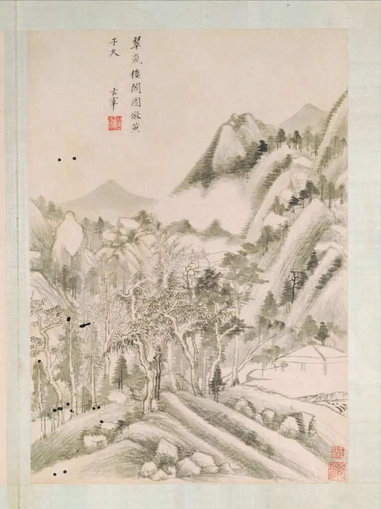 第二开,墨笔。自题:“翠岚楼阁图,仿黄子久。玄宰。”钤“董其昌印”。鉴藏印钤“男祖源珍藏”、“王时敏印”。