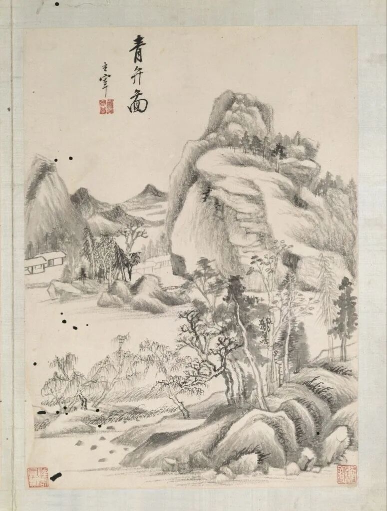 第五开,墨笔。自题:“青弁图。玄宰。”钤“董其昌印”。鉴藏印钤“男祖源珍藏”、“烟客真赏”。