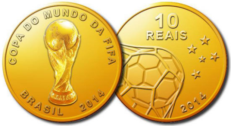 巴西世界杯共发行了9枚纪念币,其中金币1枚、银币2枚、铜镍合金币6枚。
