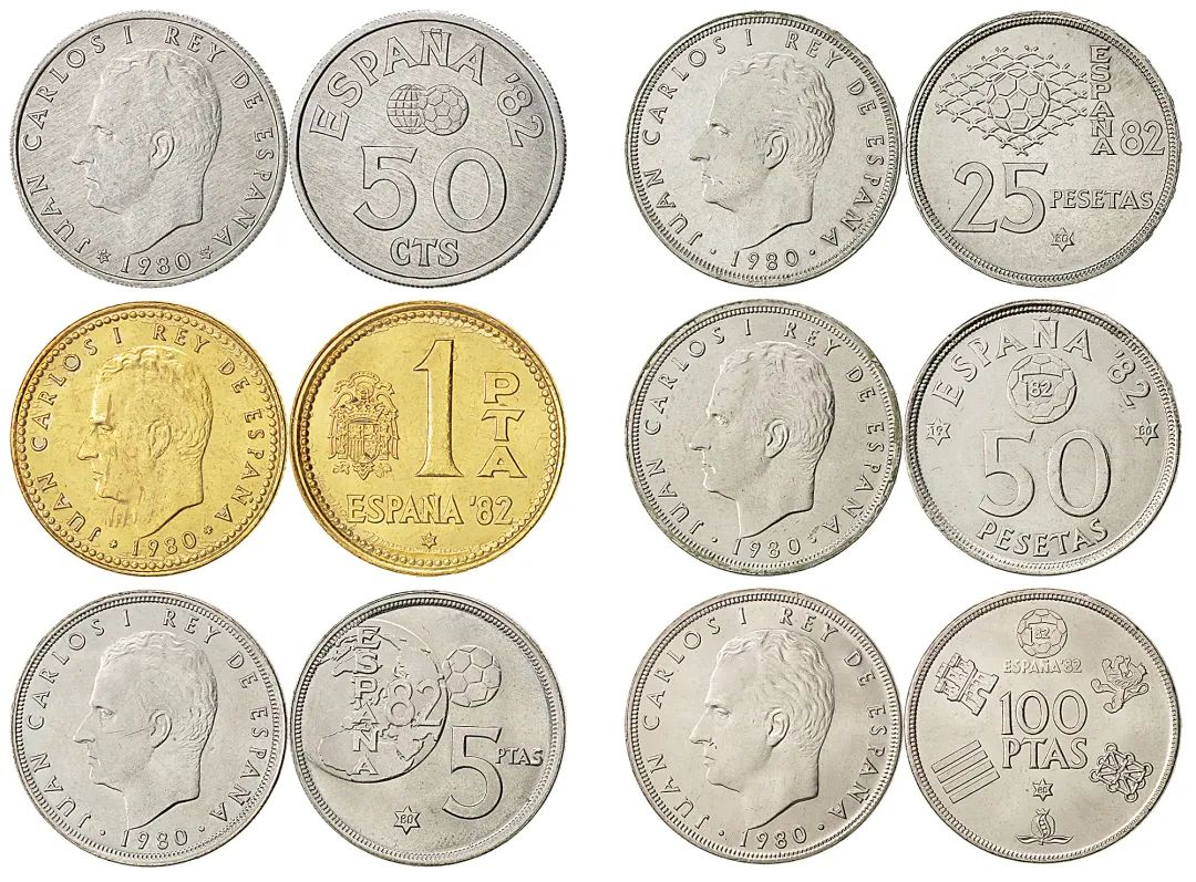 1982年西班牙世界杯发行了6枚流通纪念币,材质分别为铝、铜、镍。