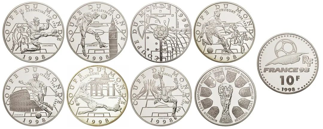 1998年法国世界杯共发行了8枚10法郎的银币,每枚发行量10万枚。