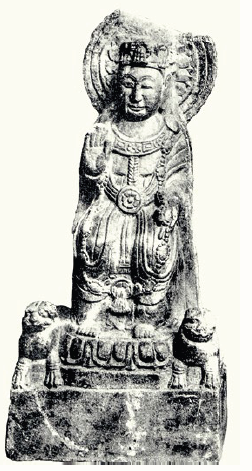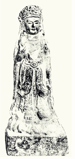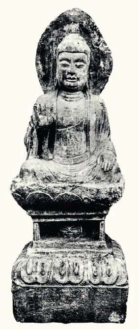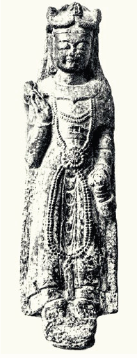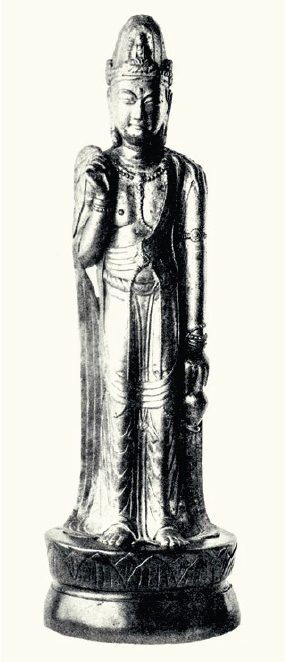 以上两躯观音像同为西安宝庆寺旧藏,后来早崎带到日本。在像式技巧方面,均与前文所述长安三年(公元703年)的德感造像相似,疑同是武周时期作品。后者右手持“灭罪”之印。