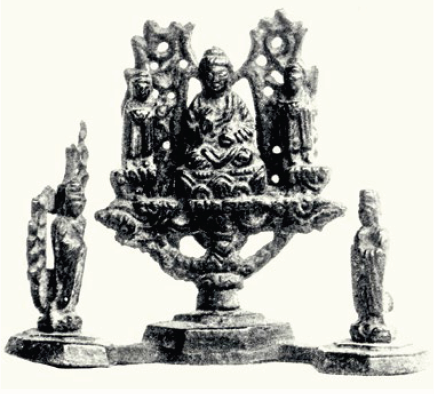 坐佛三尊黄玉石像。高一尺。黑田藏。