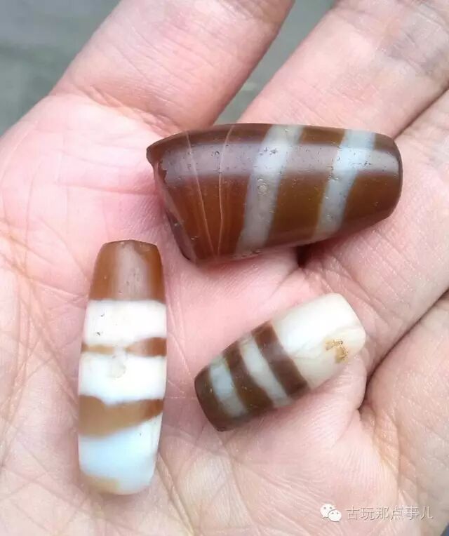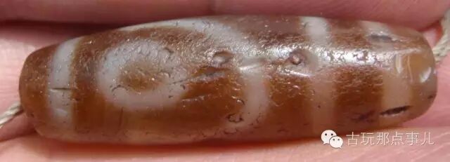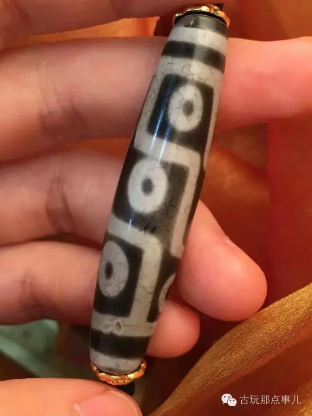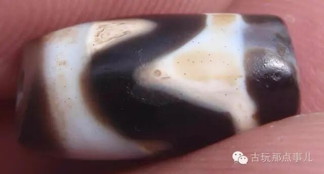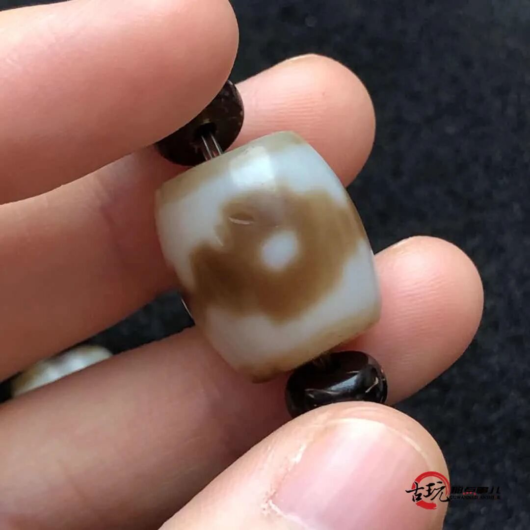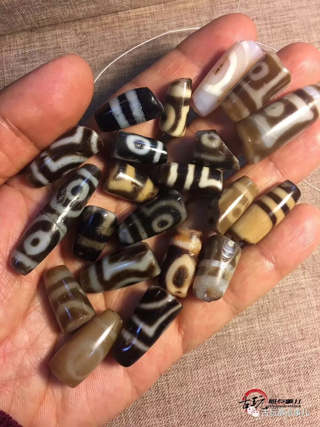 那么天珠究竟是什么?我的理解,天珠的材质是来源于喜马拉雅山域的一种玛瑙质矿石,最好的是接近羊脂玉一般的乳白色,其次是象牙黄色,再次是比较通透的普通玛瑙质地,一般都没有或较少玛瑙纹。天珠的产地是在印度阿富汗一代的中亚地区,通过一些天然药物再经高温,刻意将黑色和白色深入玛瑙内,绘制出一些简单图饰,眼纹和波浪纹是最常见的,但这些眼和波浪以及其他线条究竟代表什么含义,没人能弄清楚,拉萨河老师认为是远古生殖崇拜,但我没机会听到他的详细解释。虽然现在我们把天珠和佛教结合在一起,用佛教的教义来解释天珠的各种纹饰,但是,我们必须记住,天珠是佛教之前的产物,甚至是早于佛教的苯教之前的产物。藏地全民信仰佛教,天珠作为财宝大多被供奉于佛前或直接镶嵌在佛像里,由于藏地资源稀缺,基本不陪葬(早期有过墓葬习俗),家庭内的天珠作为最重要财产代代相传,经千百年来虔诚佛教徒的摩挲传咏,的确汇聚天地灵气,能让人一见倾心。目前遗存的真天珠一般分为至纯和旁系,主要由材质和纹饰来区别,至纯大多流传在藏地,而旁系大多流传在印度阿富汗地区,完整至纯天珠的存世量,各方说法不一,但我感觉“不超过一两万颗”的说法比较靠谱。至于天珠的护身功能,那是见仁见智,只有靠自己去佩戴体会。对于个人的福祸,我更倾向因果,所谓“菩萨畏因,凡人畏果”,只是看得明做得到的人不多罢了。