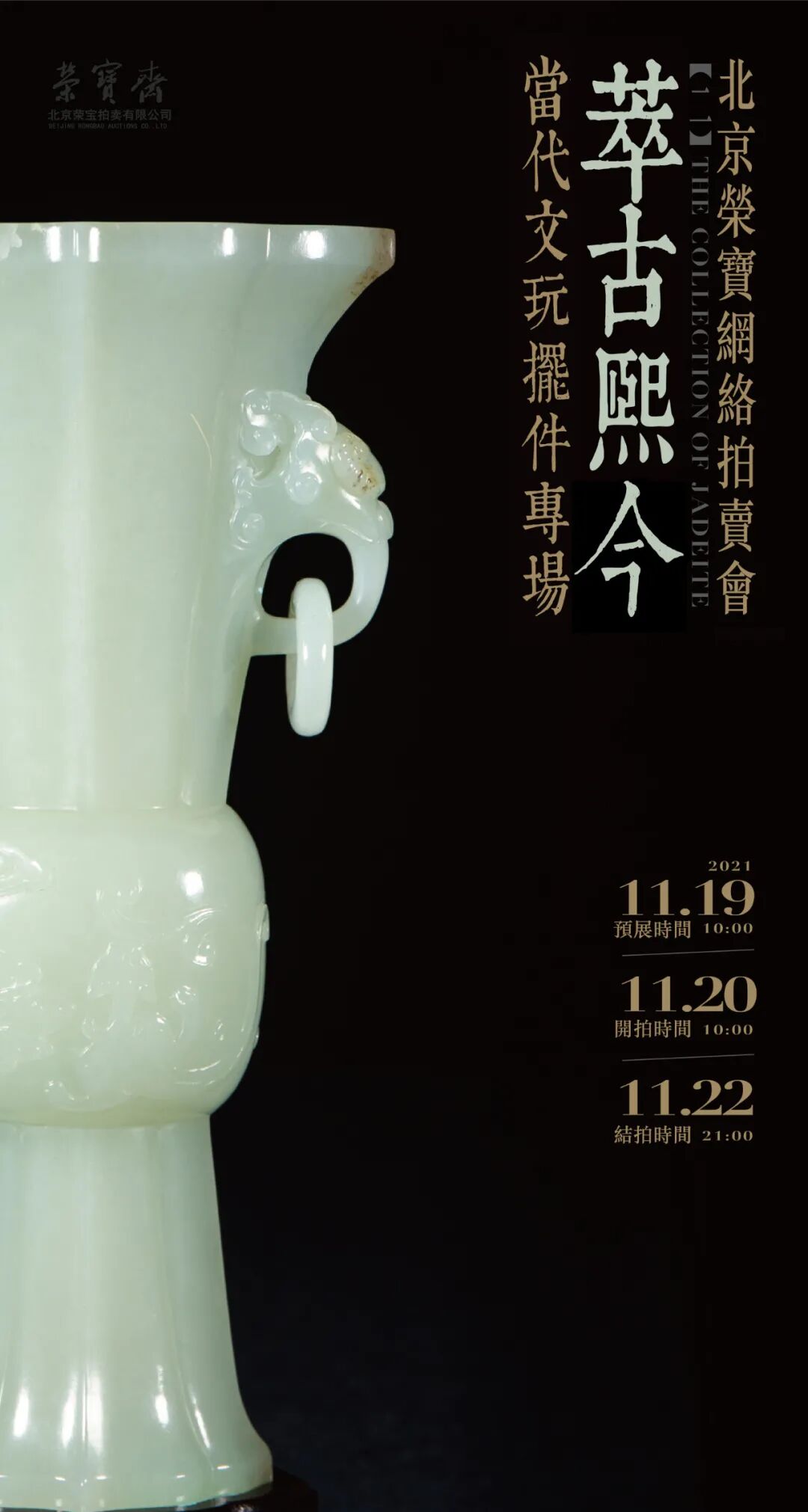 北京荣宝——萃古熙今·当代文玩摆件专场网络拍卖会(第二期)将于11月19日10:00—11月20日10:00开启线上预展,并于11月20日10:00开拍,11月22日21:00结拍。