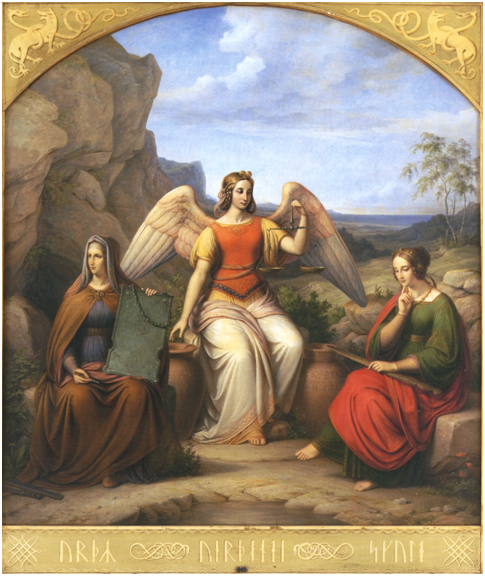 世界树有三条树根,一条通往神之国,根下涌出乌尔德之泉——诸神开会之所,泉边住着掌管命运的诺伦三女神:乌尔德、薇尔丹蒂、诗蔻蒂,分别对应着古代日耳曼语里“存在”一词的过去时、现在时和未来时。她们会在小木片上写下每个人的命运,召唤英雄们在有生之年勇敢地完成上天赋予他们的使命。