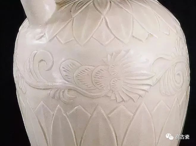 肩部宽阔,上刻覆莲纹,花筋叶脉明显。扁圆腹,肩腹交接处饰两道凹弦纹,腹部刻重瓣仰莲纹,平底,宽圈足。此瓶通体优美大方,坚胎白釉加之精致刻花纹饰,使此瓶成为不可多得的定瓷精品。