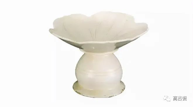 白釉花口高足盘口径14.7厘米,底径9.7厘米,高10厘米。外有垂浆泪痕。盘为五曲尖瓣花式口,斜腹内饰五瓣莲花。高足呈覆钵形,内壁无釉,饰弦纹,以釉接承盘。