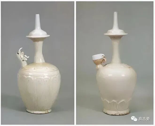 肩塑龙首流,龙首高昂、前额突耸、张口露齿,下颌饰一绺龙须,器形修长秀雅,纹饰精细流畅,可谓是千年定瓷的代表作。静志寺静众院两座舍利塔地宫出土定瓷中有多件净瓶,那何谓净瓶?!这种瓶子又有什么作用,为何出现在佛塔地宫中?!